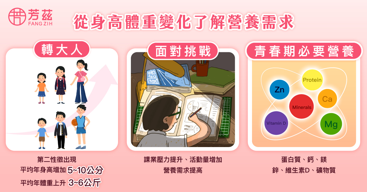一般男生於 9 歲、女生於 8 歲即準備「轉大人」,依個人體質不同,通常這時期可持續至 20 歲。在孩子的第二性徵逐漸明顯、正式邁入青春期,平均年身高可能增加 5 至 10 公分、體重上升 3 至 6 公斤。此時課業壓力提升、活動量大,能量與營養的消耗也跟著加倍,除了需要足夠蛋白質來幫助組織生成修復,還需要鈣、鎂、鋅、維生素 D 等礦物質幫助正常發育。