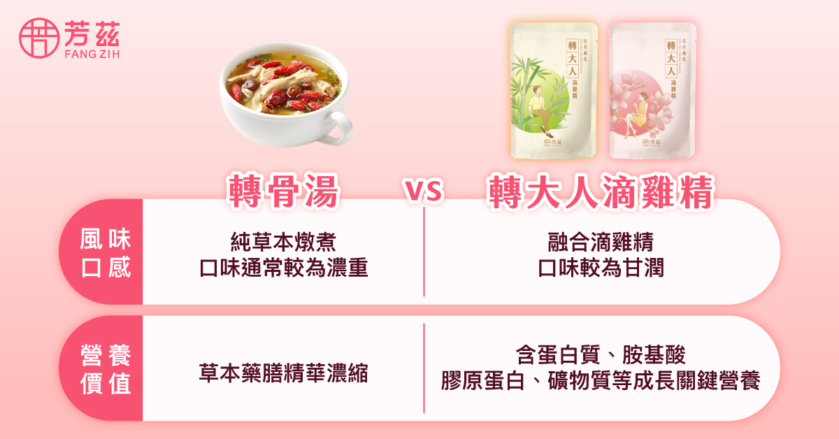針對青春期孩子的調理需求,第一時間會想到中醫的轉骨藥、轉骨湯,但濃厚的藥膳氣味,容易令味蕾較成人敏感的孩子抗拒飲用。加上純中藥蛋白質含量有限,對於肌肉骨骼的幫助不多。相較之下,市面上另一種融合滴雞精的選擇——「轉大人滴雞精」,兼具漢方滋補與營養科學的平衡,且滴雞精讓適口性大幅提升,對於青春期孩子的接受度更好。