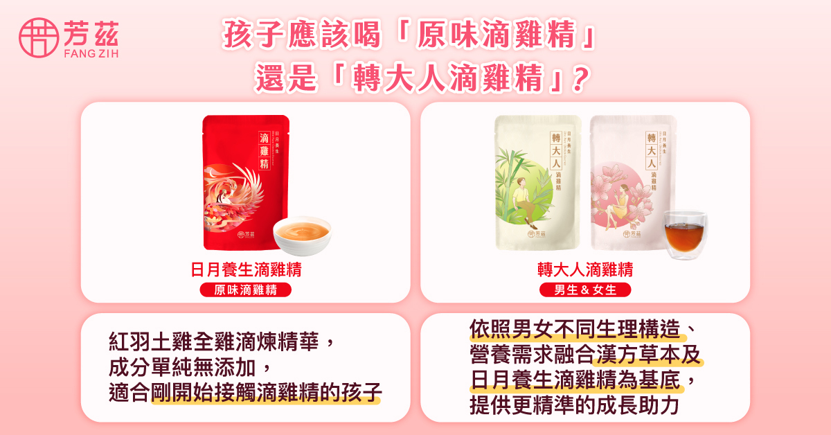 轉大人調理怎麼樣算是「太補」、「補過頭」,首先是轉大人飲品使用年齡並非越早開始越好,若兒童時期有滋補需求,可從純滴雞精開始。而專為青春期設計的芳茲轉大人滴雞精,配方以支持能量代謝、體力恢復、學習活力為主軸,非熱補或大補性質。在轉大人時期推薦每日飲用,且長期飲用更能見效。