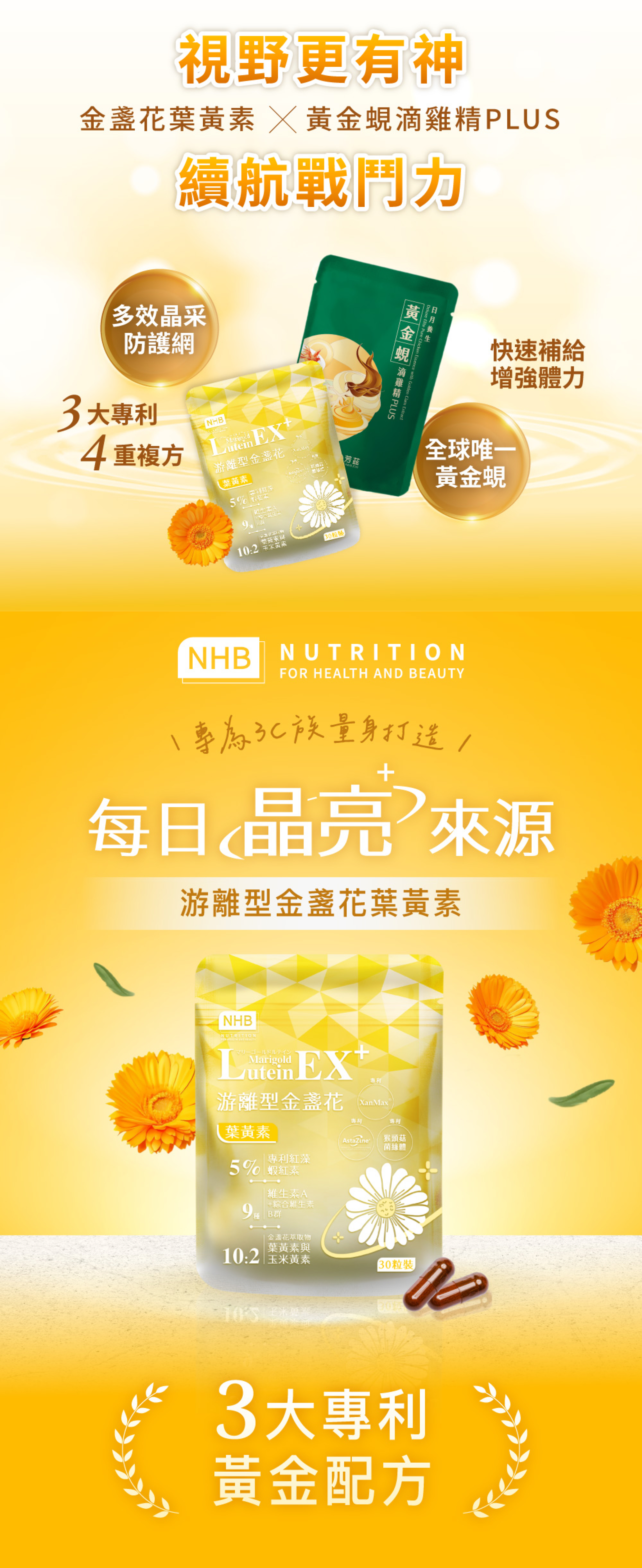 NHB游離型金盞花葉黃素膠囊1袋+黃金蜆滴雞精20包 (常溫環保包裝組)