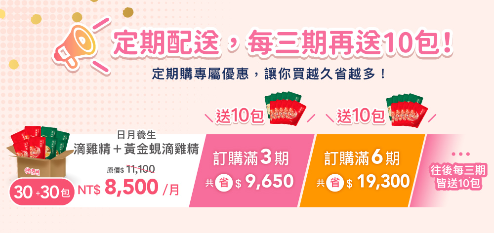 · 每三期贈送 "5包滴雞精+5包黃金蜆滴雞精"