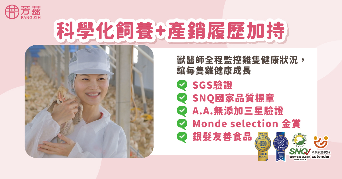 也正是因為從雞隻飼養時就用心把關,因此芳茲的日月養生滴雞精不但經過國內SGS驗證,更是業界唯一完整榮獲SNQ國家品質標章、A.A.無添加三星驗證、Monde selection 金賞、銀髮友善食品標章等四項殊榮的高品質滴雞精。