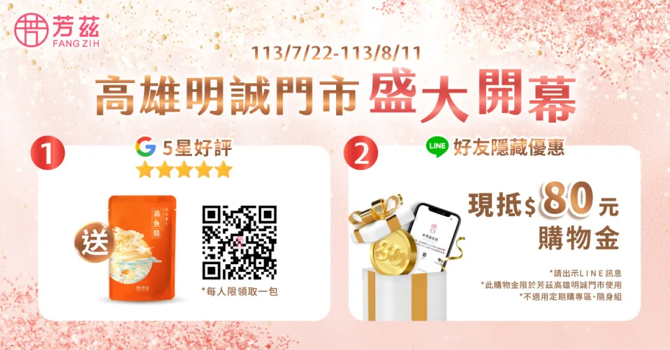 開幕期間,凡進店消費的顧客都能獲得精美的下單禮,在現場與芳茲商品拍照並依活動內容完成任務,即可免費獲得「日月養生滴魚精」1包(價值$190)。同時,為了回饋會員多年的支持與厚愛,只要收到芳茲LINE官方的VIP隱藏訊息,即可憑該訊息至高雄明誠門市使用專屬購物金,消費滿額還有機會獲得NHB新品「蔓越莓益生菌膠囊」1瓶(價值$1,380),陪女性一起面對夏季的私秘困擾。