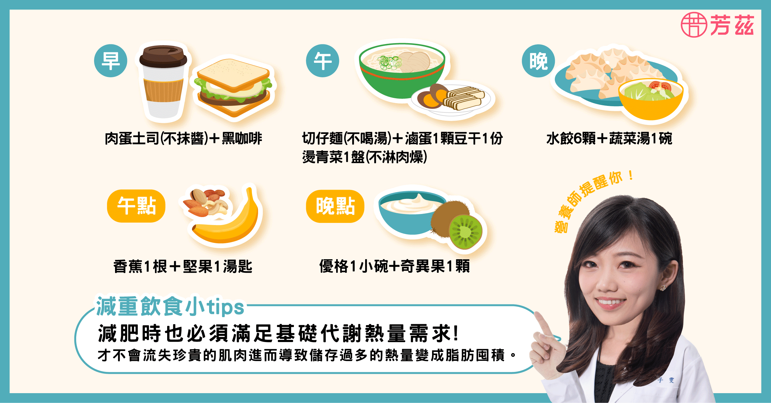 此外,在減重的過程當中,我們應該要把握均衡飲食的概念。簡易的均衡飲食是要包含澱粉、蛋白質、蔬菜,早晚一杯奶,像小敏的早、午餐只吃到澱粉、晚餐的鍋貼又很油膩,到底要怎樣改才能符合均衡飲食的概念呢?大家可以參考以下的飲食範例: