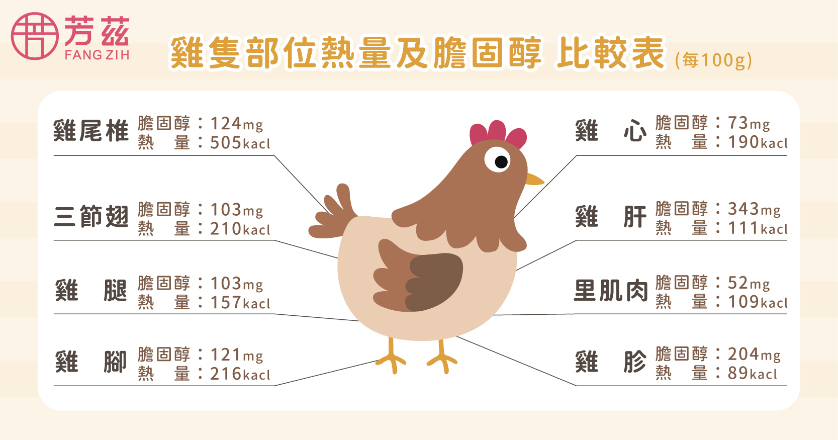 根據衛福部的營養標示指出,雞肝的膽固醇 343mg/ 100g、雞胗204mg/ 100g,受許多人歡迎的雞腿及三節翅則有103mg/ 100g都高於里肌肉(52mg/ 100)的膽固醇含量許多。