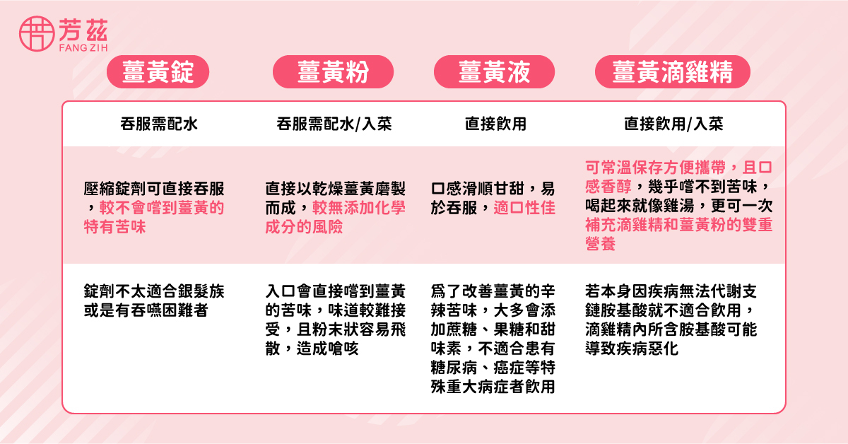 以下就提供各式薑黃營養補充品的食用方式,以及優缺點比較表供大家參考: