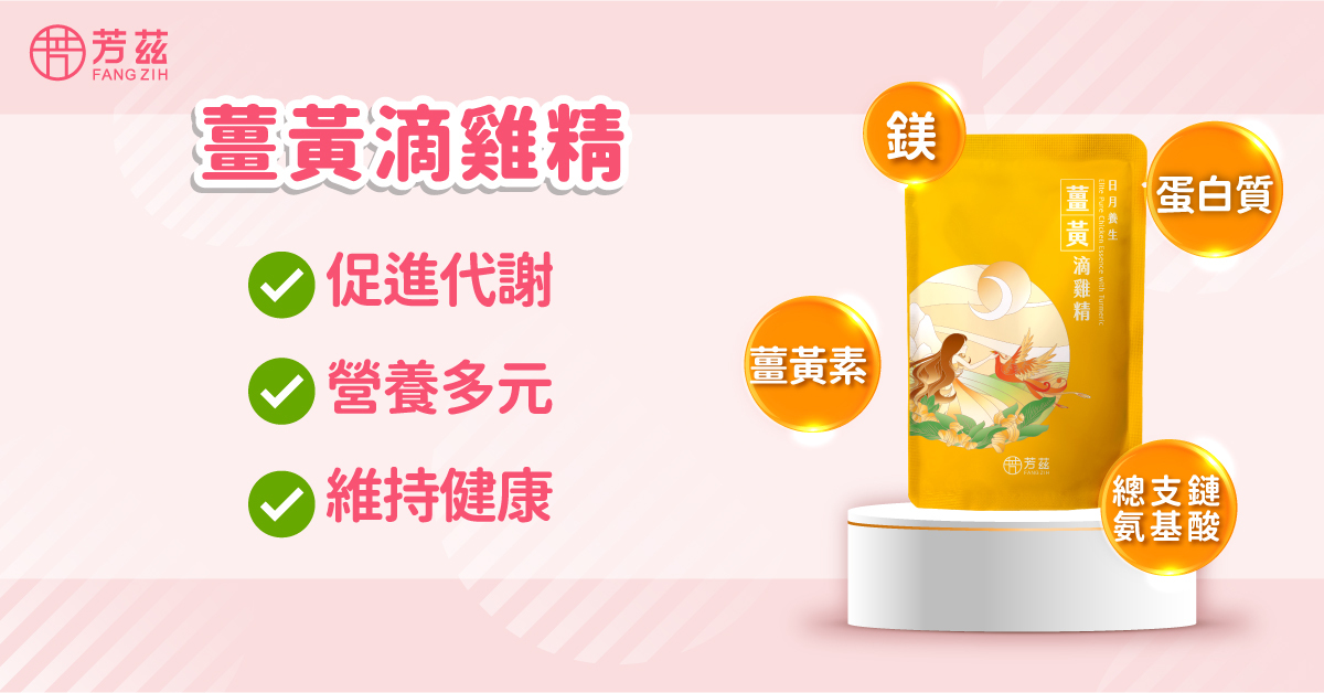 像是芳茲推出的新品「日月養生薑黃滴雞精」就是很好的選擇,結合日月養生滴雞精與薑黃,兩種精華合而為一,不僅可同時補充薑黃素、鎂、總支鏈胺基酸、蛋白質、膠原蛋白等營養,其中添加的有機三色薑黃粉,也能讓身體補充到更多元的營養!