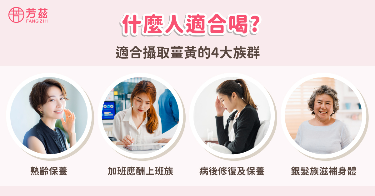 加班應酬上班族:加上薑黃素能調節生理機能、促進代謝,因此很適合和久坐或是常需要應酬的上班族。