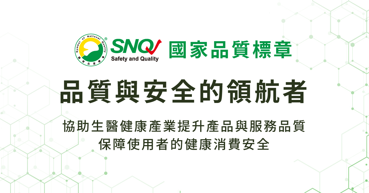 「SNQ國家品質標章」(Symbol of National Quality)是由台灣的民間組織–生策會/生策中心於2004年所推行與生醫保健產品和服務的安全與品質認證標準,著重『安全』與『品質』,以科學實證為核心,來保障健康消費安全。自成立以來,每年審視市面上健康保健服務與產品,提供消費者高品質的生技醫療產品,免除安全與品質疑慮。SNQ在消費者心中已成為選擇優質產品和卓越服務的指標及安全消費識別。