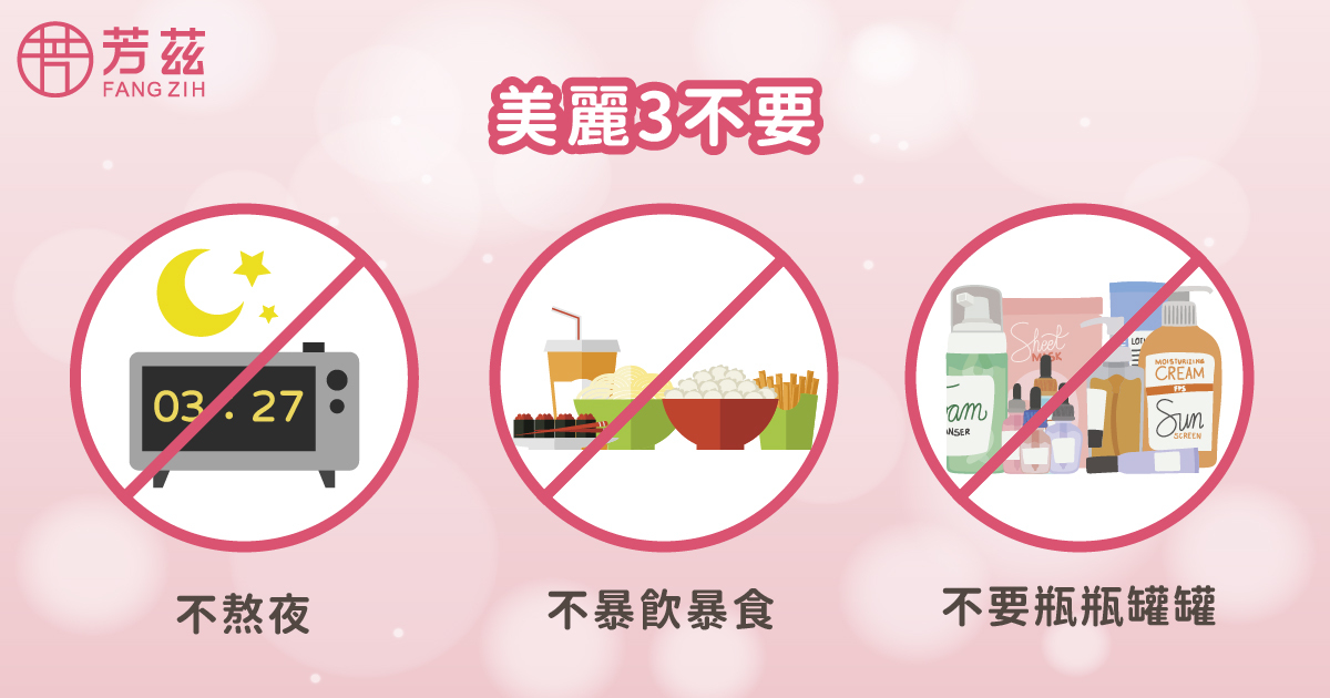 夜晚是新陳代謝的旺盛時間,膠原蛋白與抗氧化機制運作,以修補在白天受到的傷害,因此善加利用優質睡眠,比任何美容療程都來得有效。睡前四小時謝絕刺激食物例如:咖啡,並且放鬆情緒入眠,確保良好的睡眠品質,隔天精神飽滿、自然散發好氣色。