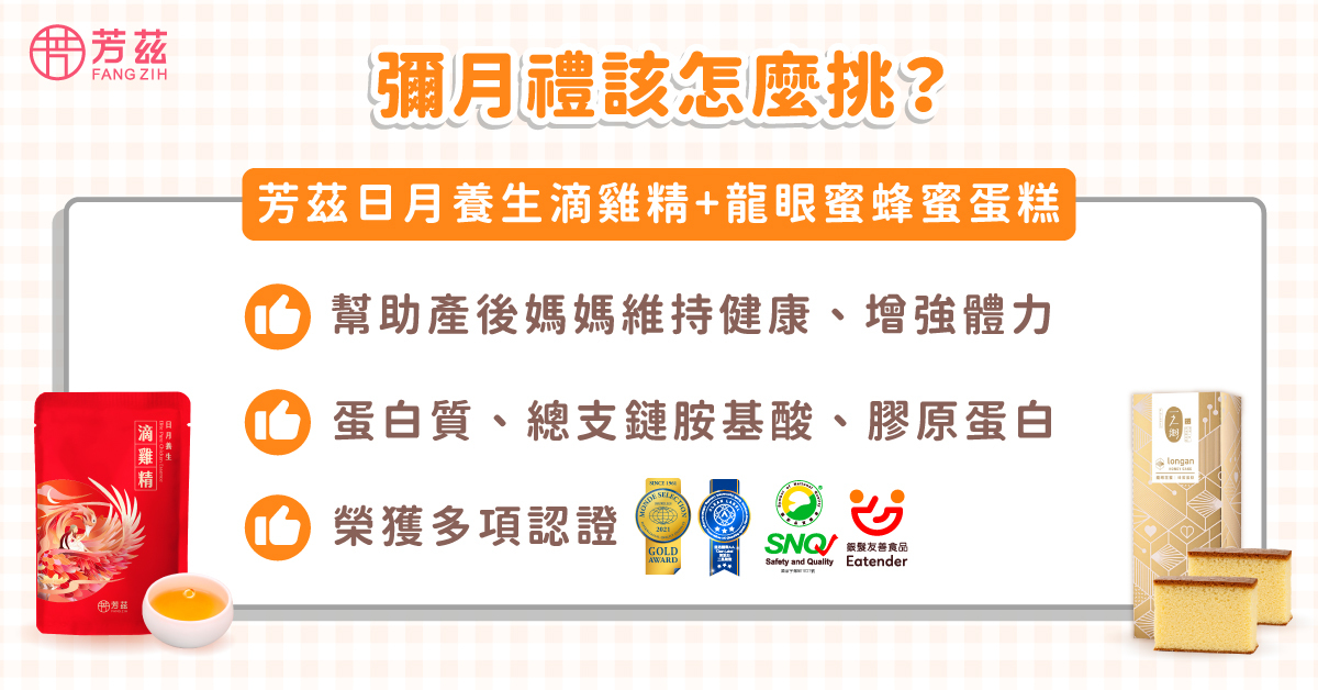 建議各位爸媽能挑選1+1的多元組合彌月禮,像是芳茲日月養生滴雞精+龍眼蜜蜂蜜蛋糕的組合,滴雞精可幫助產後媽媽維持健康、增強體力,芳茲滴雞精透過蒸氣不回流技術,將全雞的營養精華滴滴裝袋,蛋白質、總支鏈胺基酸與膠原蛋白都能快速補充,且榮獲Monde selection 金賞、國際AA無添加三星驗證、銀髮友善標章與SNQ國家品質標章等認證,讓孕媽咪能好好補充元氣,而香甜的龍眼蜂蜜蛋糕就能送給親朋好友與他們一起分享這份喜悅。
