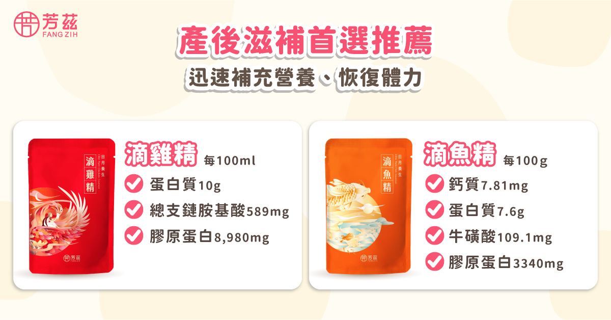 建議可以多補充滴雞精或滴魚精這類的養生保健飲品,也是很不錯的選擇,滴雞精含有蛋白質和總支鏈胺基酸、膠原蛋白,可以幫助產後媽咪調理身體機能,而滴魚精中的牛磺酸也能幫增強體力,陪你健康又有活力的面對這個新生活。