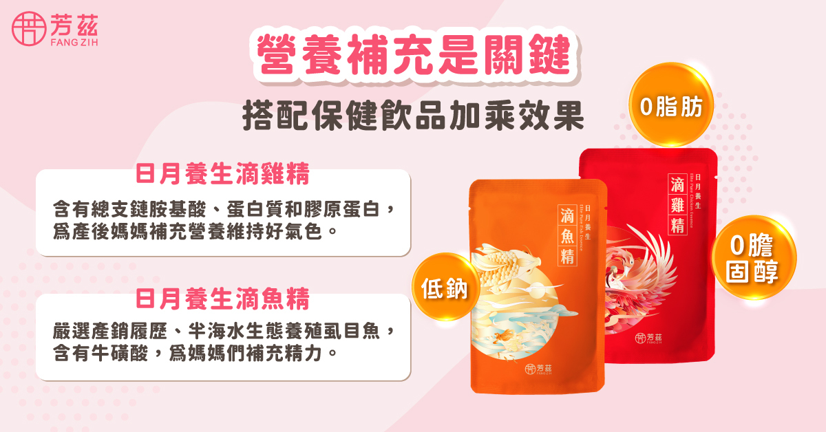 而說到喝清淡的魚湯來補補身,若是沒有時間料理其實也能選擇養生的保健飲品當作補給體力的方式,像是芳茲嚴選產銷履歷、半海水生態養殖虱目魚的日月養生滴魚精,就可以是作為產後媽媽補充能量的好幫手,裡面含有牛磺酸成分,可以為媽媽們補充精力,早上喝一包滴雞精為自己提供補充營養,下午一包滴魚精提振精神,而且芳茲滴雞精、滴魚精都是零脂肪、零膽固醇、低鈉,補充起來不僅對身體不會造成負擔,也能讓自己在這期間快速恢復元氣。