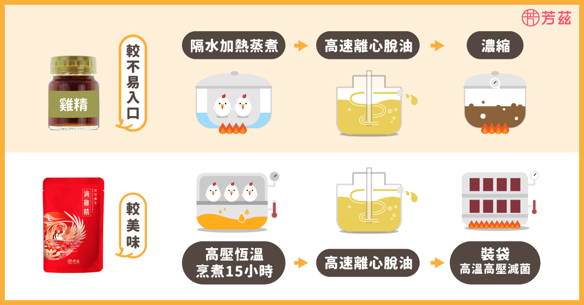 雞精與滴雞精,都是以更精緻的製作方式將雞隻的精華萃取出,並去除多餘的雜質、油脂等。不過,由於雞精與滴雞精的製程不同、選用雞隻品種有差異,導致兩者在風味上有很大的差異。