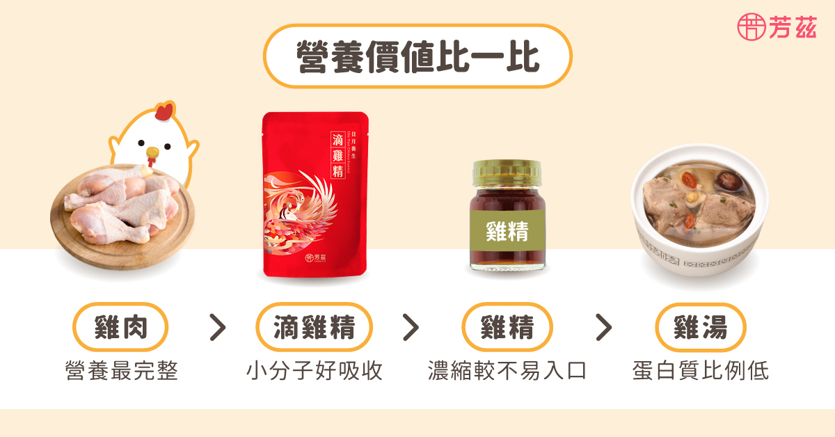 營養價值最高且最完整的是雞肉,其次是滴雞精和雞精。滴雞精相較於雞精更容易入口且美味,因此建議優先選擇滴雞精,再考慮雞精,最後則是自製的雞湯。