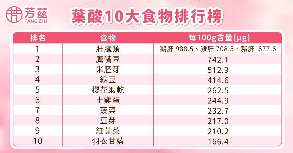※補充葉酸的建議食物排行榜: 五穀類、肝臟類、蛋類