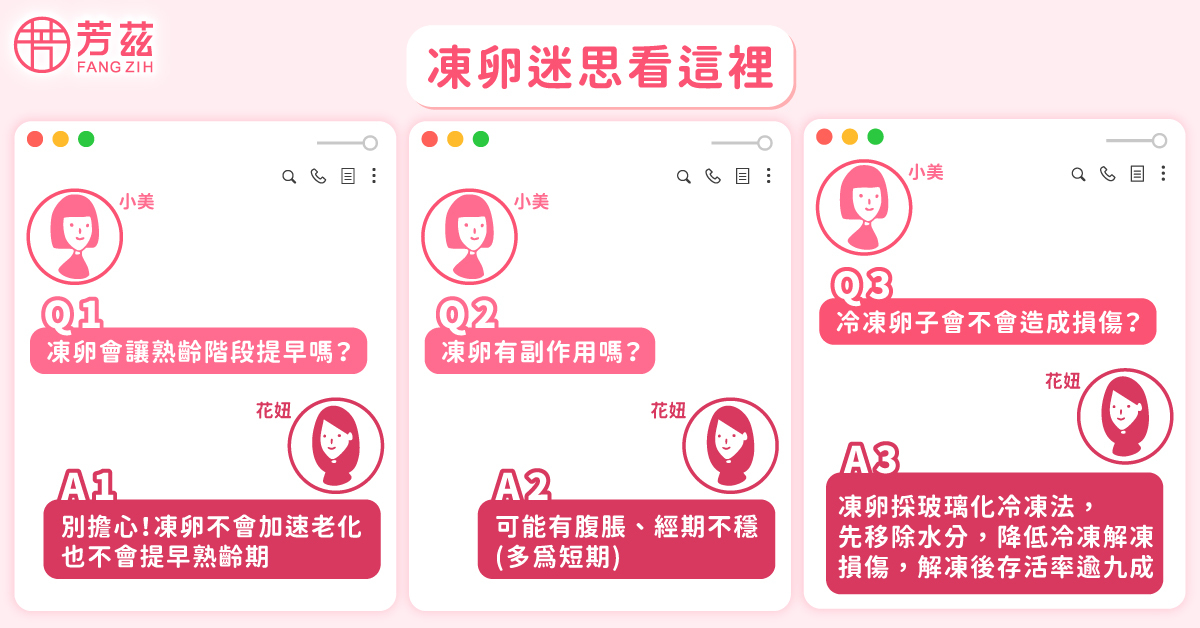 有些人擔心凍卵會讓女性提早進入熟齡期,但實際上這是常見的誤解。凍卵過程中僅是短期刺激使多顆卵子同時成熟並進行冷凍,這並不會改變身體自然老化的節奏,也不會加速卵子消耗。因此,凍卵並不會導致熟齡期提早到來。
