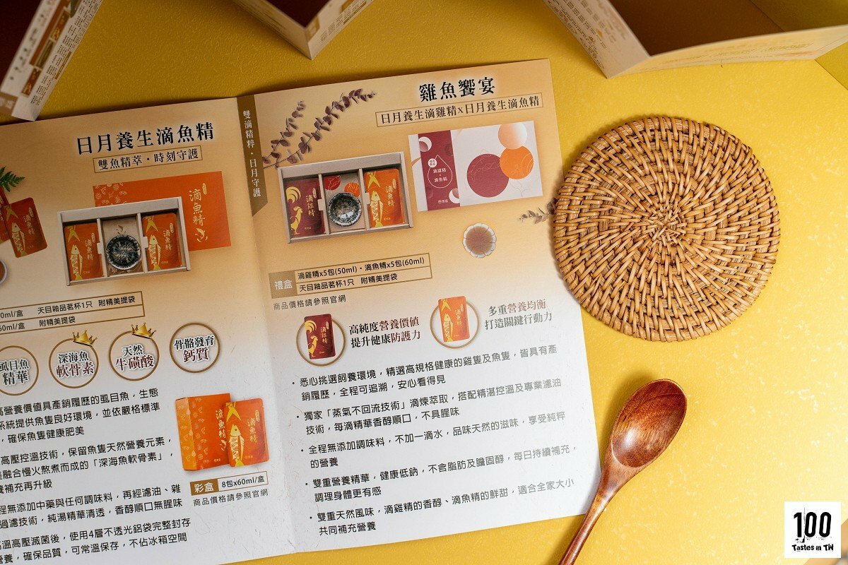 雞魚饗宴禮盒集海陸精華之大成,內襯隔板左右兩格分別有滴雞精(50ml)、滴魚精(60ml)各 5 包,