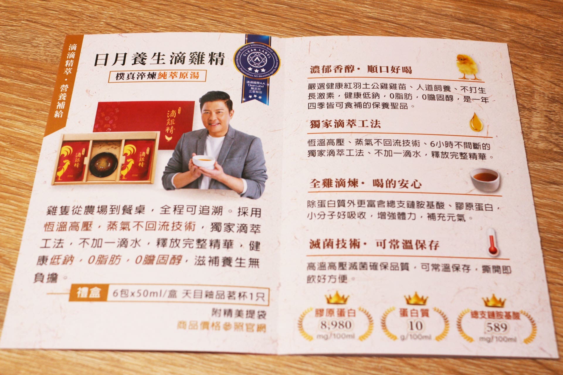 滴雞精有著蛋白質含量10g/100ml,總支鏈胺基酸達589mg/100ml,膠原蛋白8,980mg/100ml等營養成份