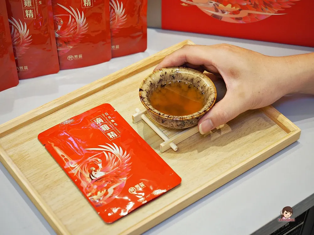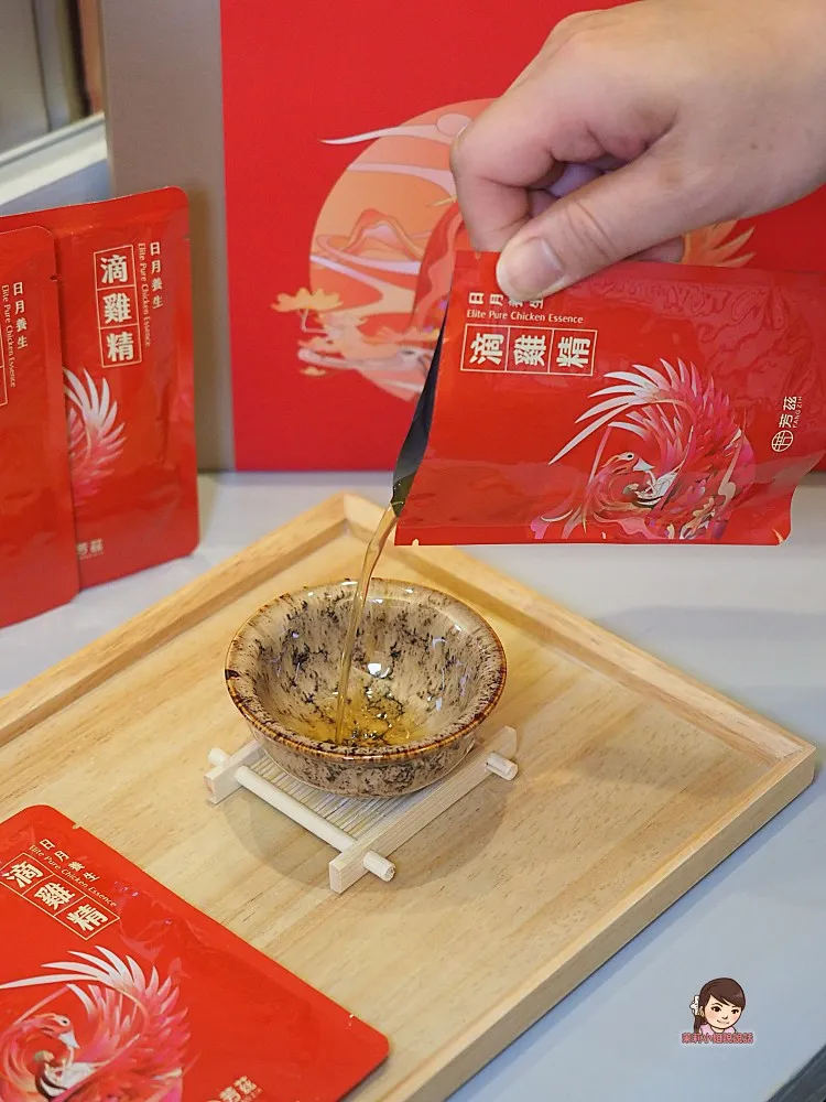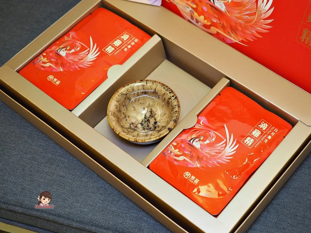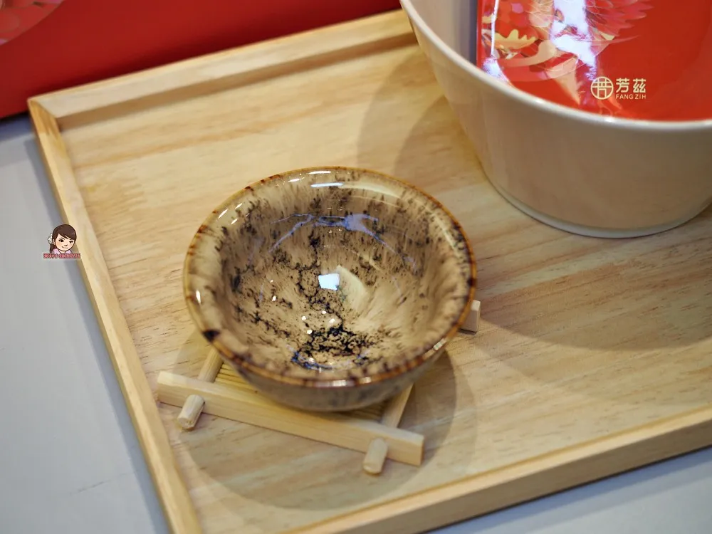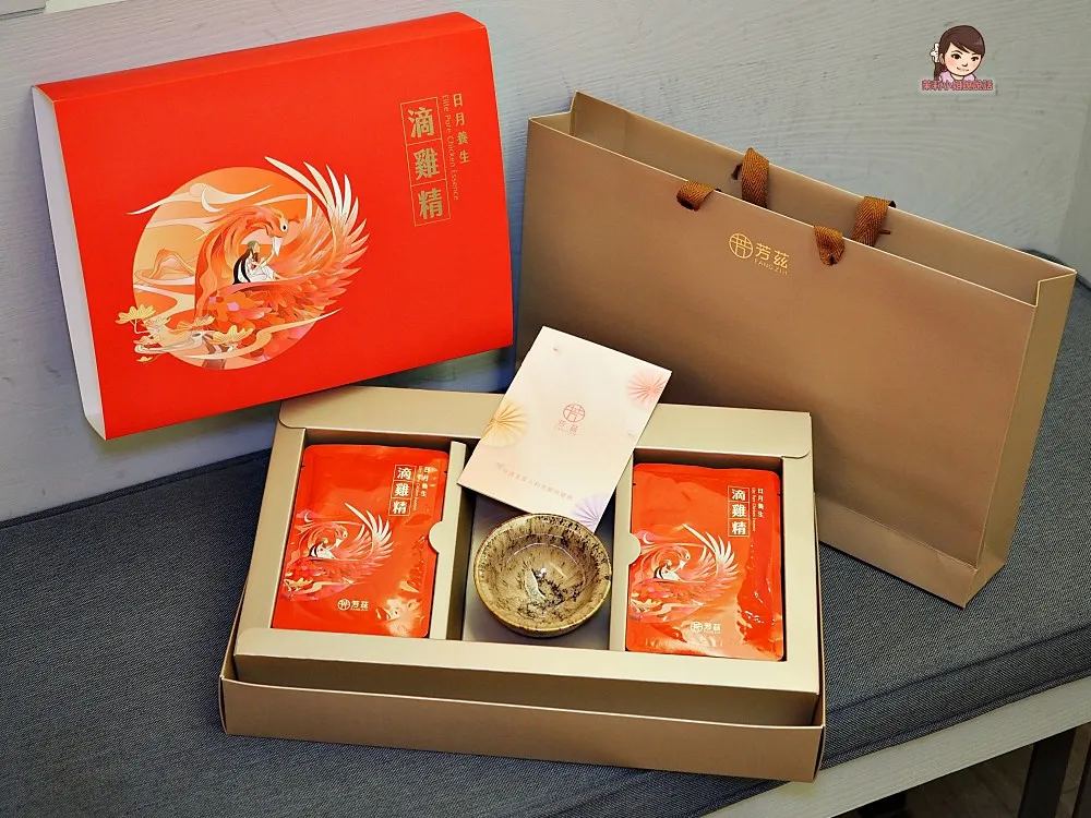 【芳茲滴雞精】真的很適合拿來送禮,香檳金色的提袋貴氣高雅,石榴紅禮盒包裝質感大方,年節餽贈親友長輩相當應景喜氣,包裝上設計的女子,代表「守護神」的象徵,意寓「守護重要的人平安美好」,禮盒裡面附贈一個「天目釉品茗杯」,是專業匠人手工打造,每一個杯子都是獨一無二,更顯尊貴。