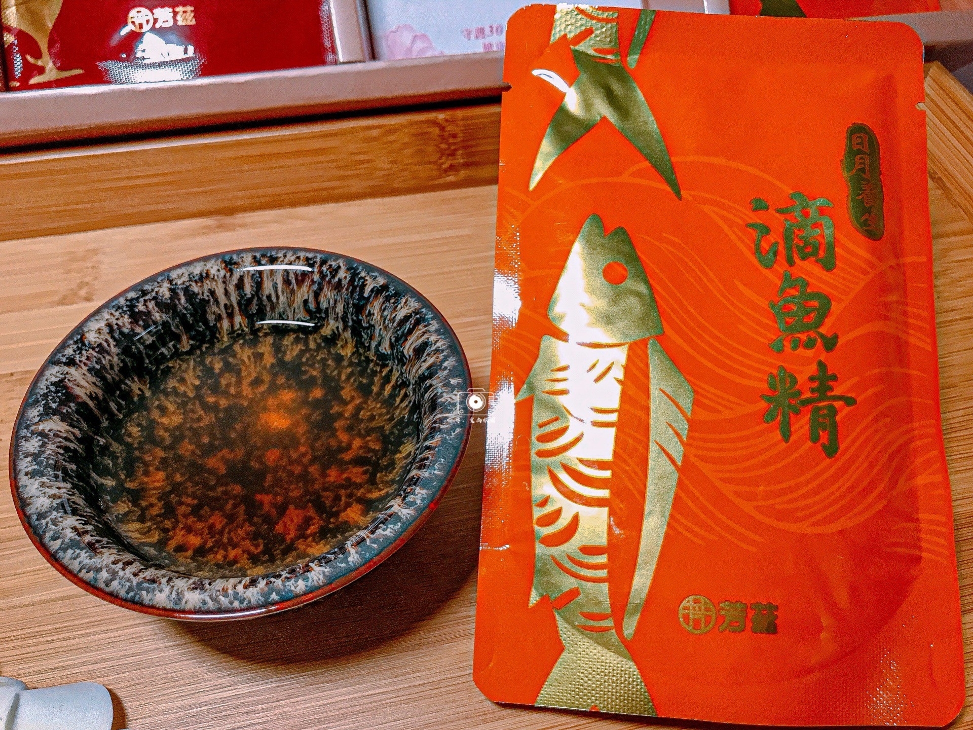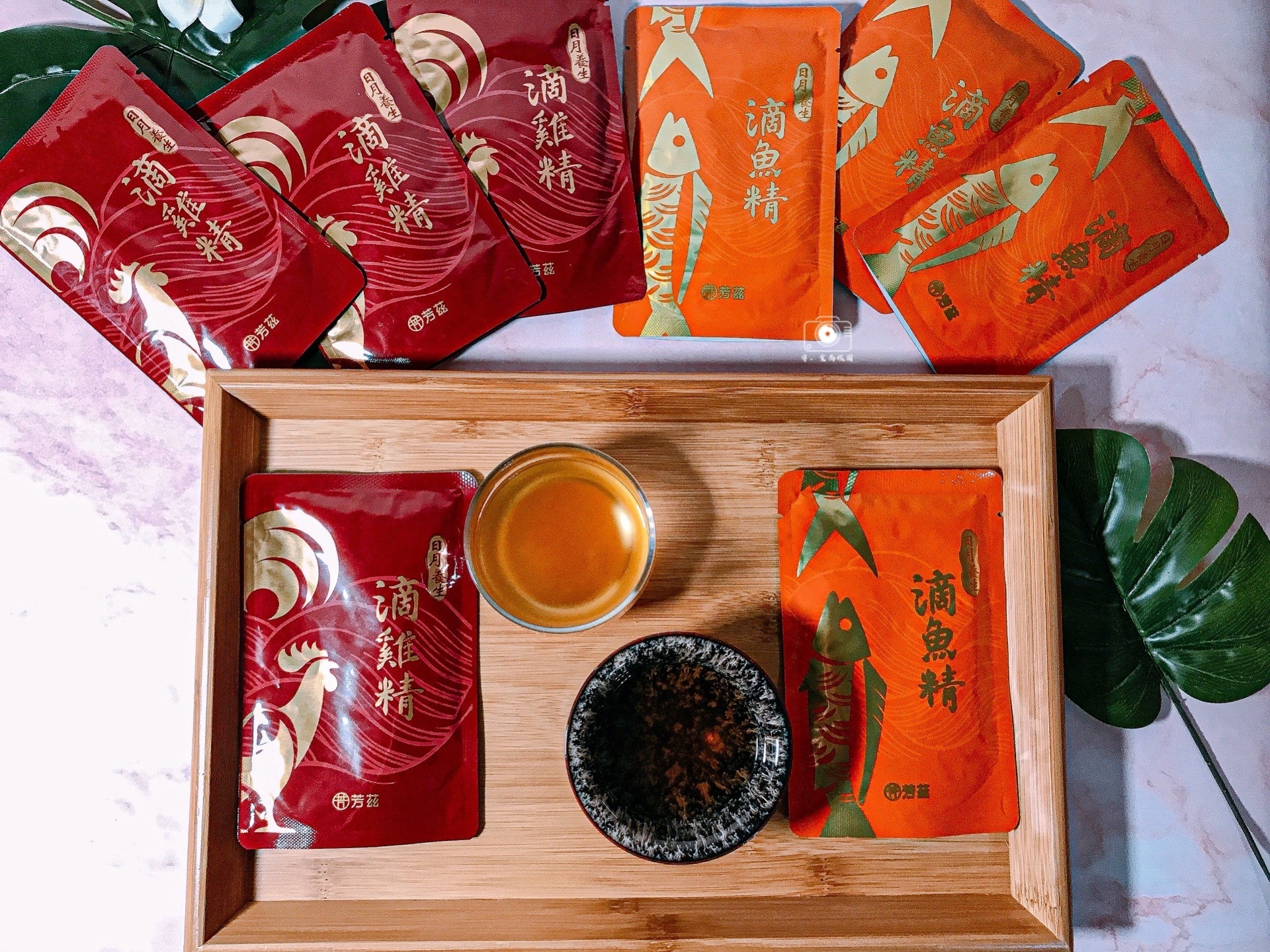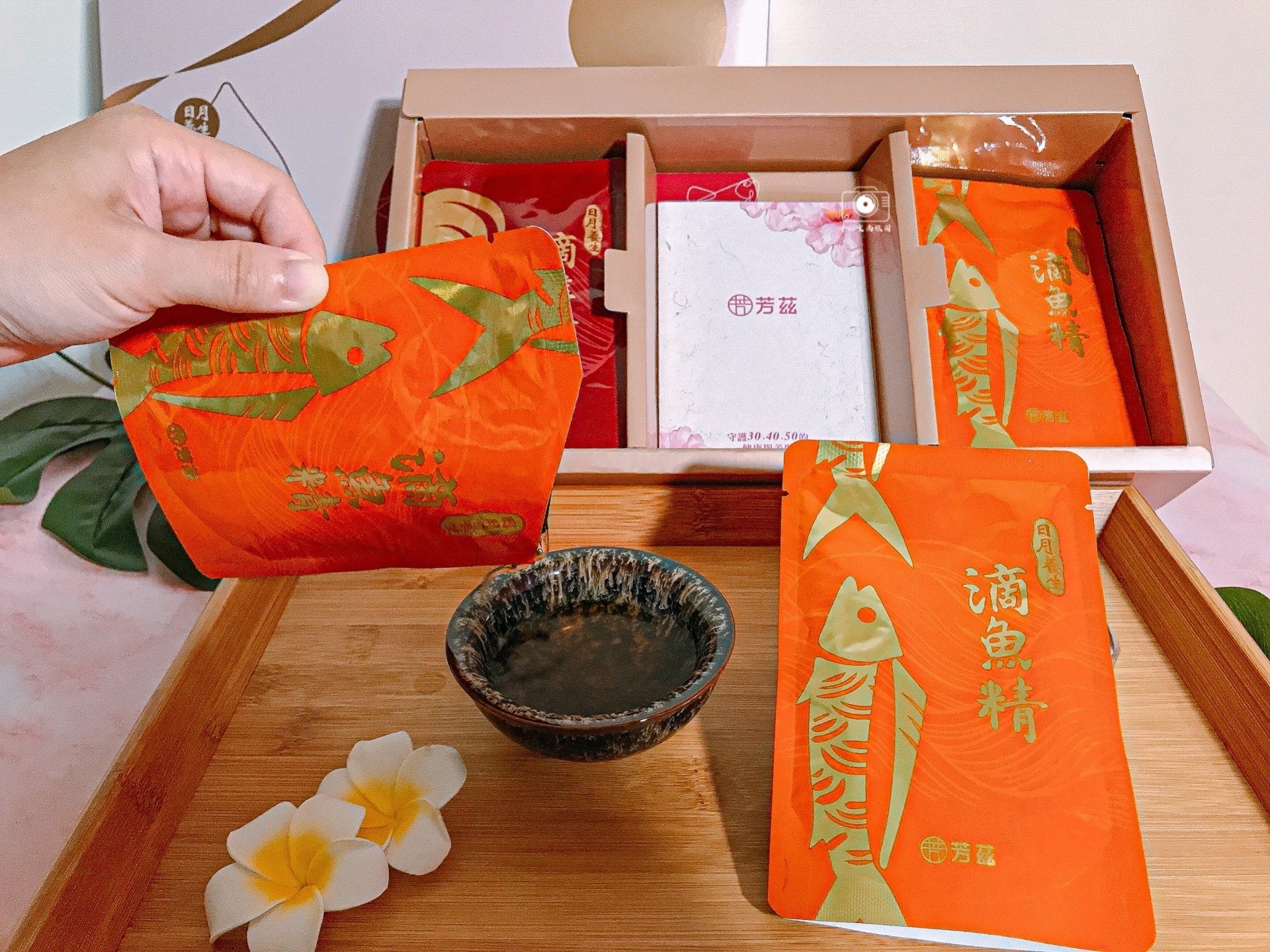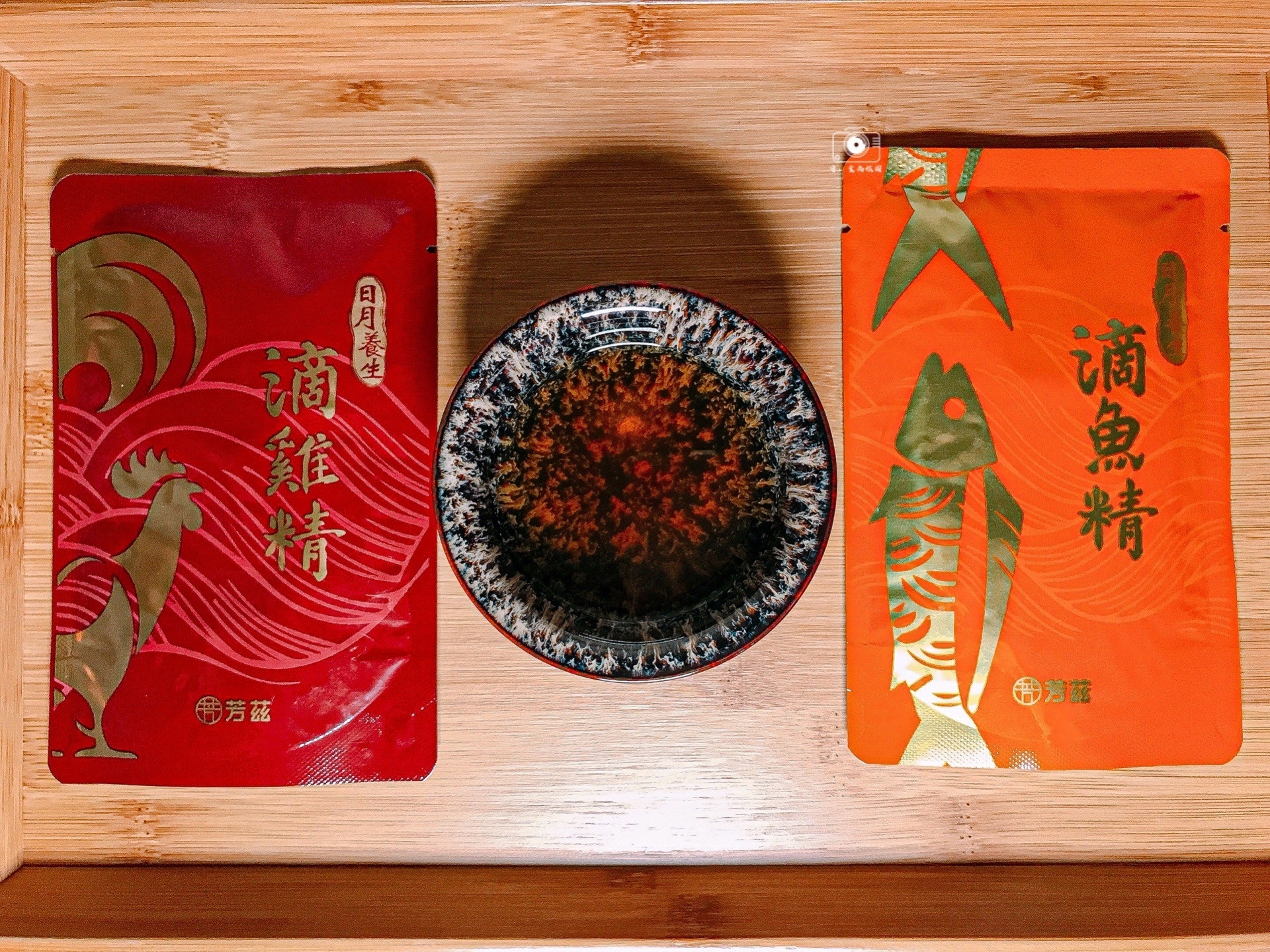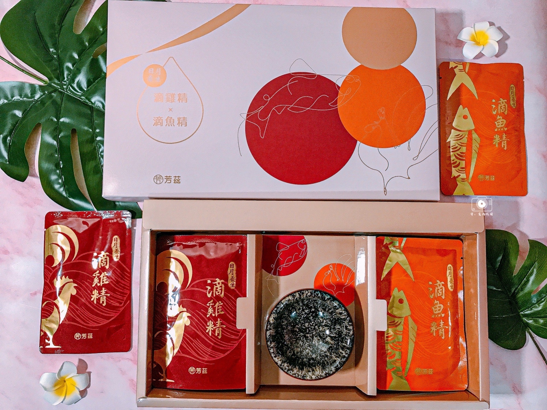 芳茲日月養生雞魚饗宴禮盒內有5包滴雞精及5包滴魚精,共10包,禮盒內還贈送一只精美的天目釉品茗杯!在懷孕中期 收到芳茲「雞魚饗宴禮盒」,滿滿的 感動,禮盒設計精美之外,貼心的附上天目釉品茗杯,讓在享受喝滴雞精、魚精當下就像品茶般的優閒。