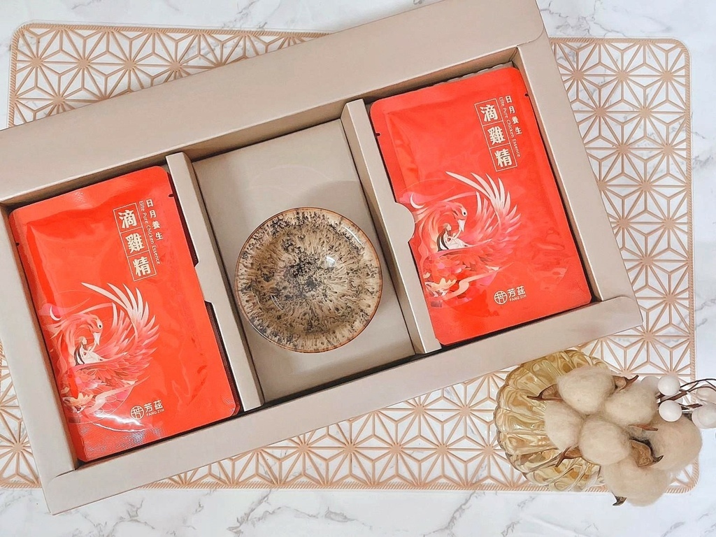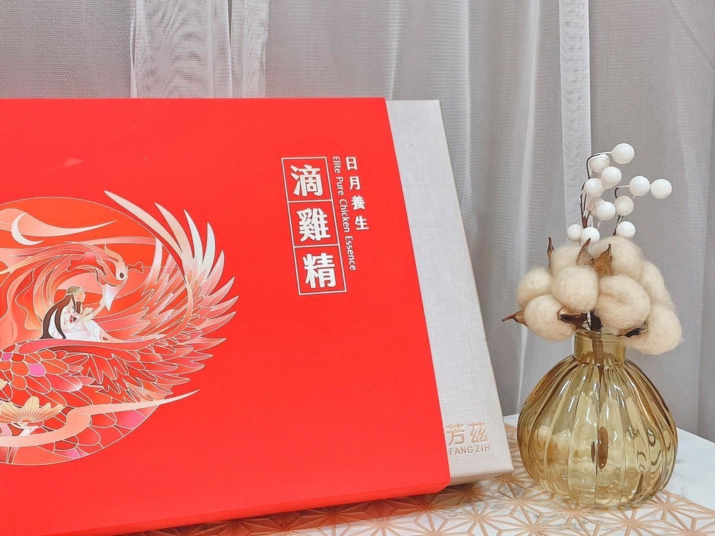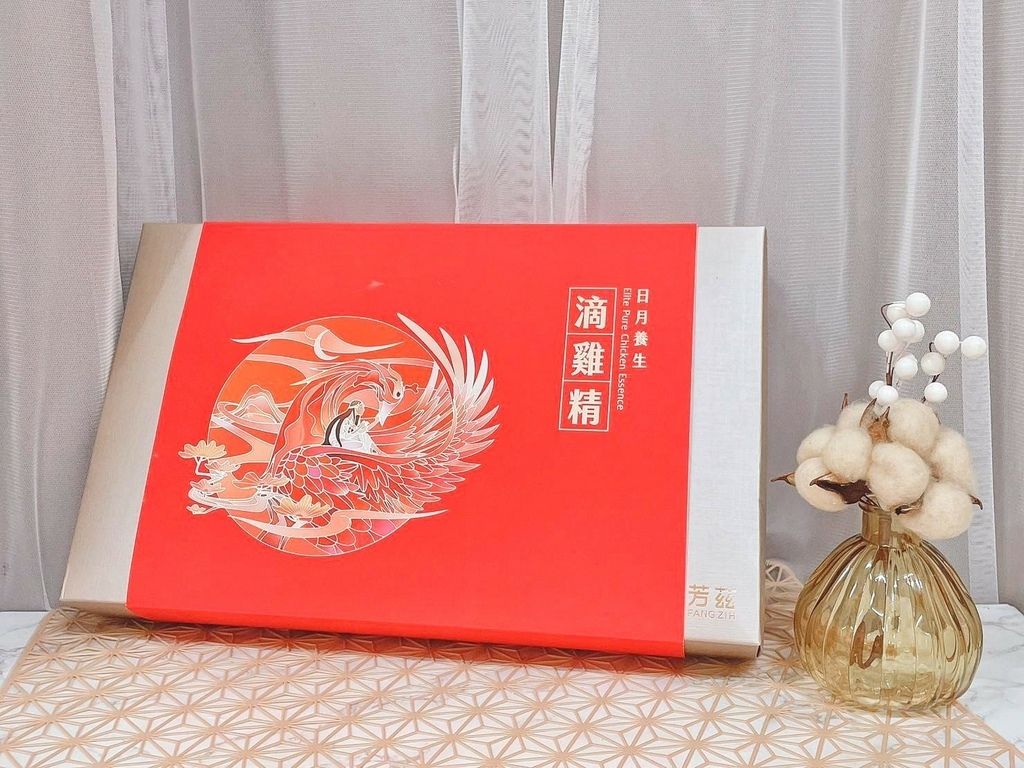要送禮也非常大器,這次日月養生滴雞精更是用金色搭配大紅色,更加有喜慶感
