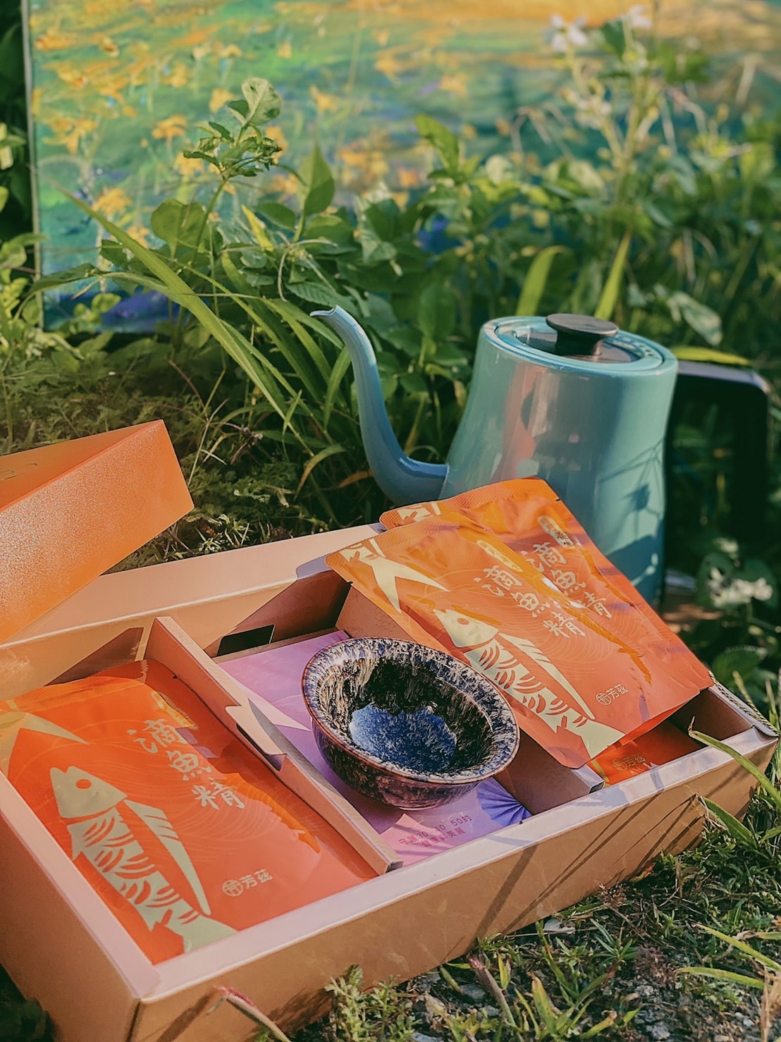 這次的芳茲日月精華滴魚精禮盒,裡面除了有6包滴魚精,還附贈了一個天目釉品茗杯,看起來非常亮眼喜慶,