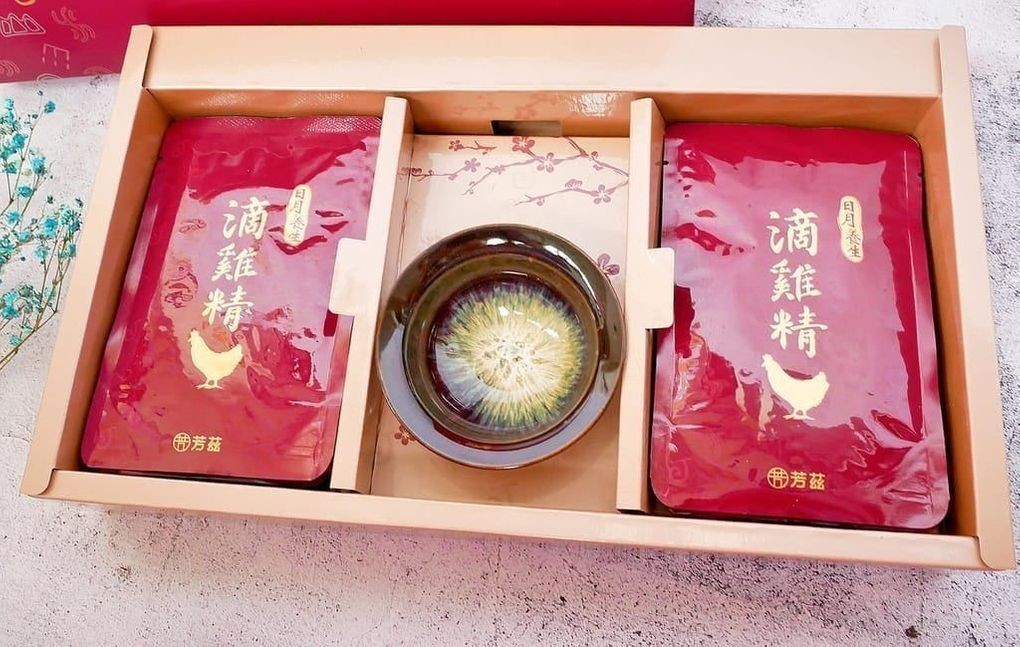 芳茲日月養生滴雞精分為櫻桃紅禮盒&彩盒版. 禮盒內附贈天目釉品茗杯