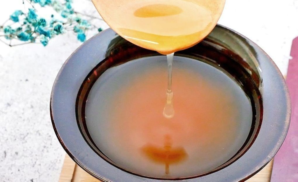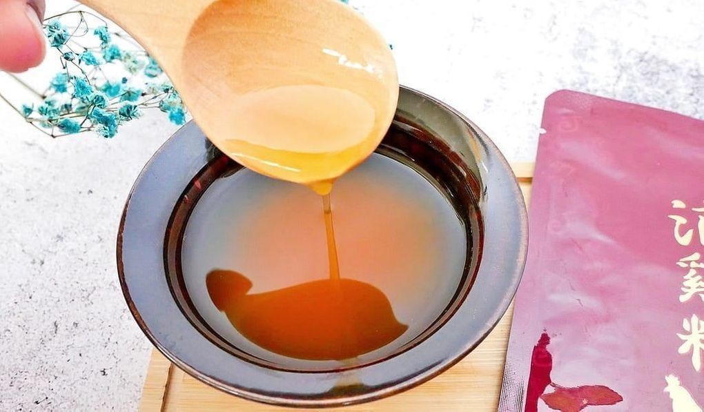 加熱後的日月養生滴雞精.撕開包裝倒出來時.會散發出雞精的香氣及琥珀色澤~