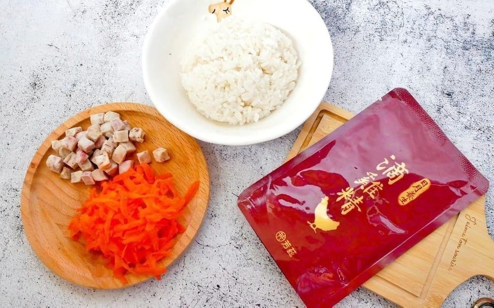 米飯半碗.滴雞精一包.水100CC.紅蘿蔔絲.芋頭丁