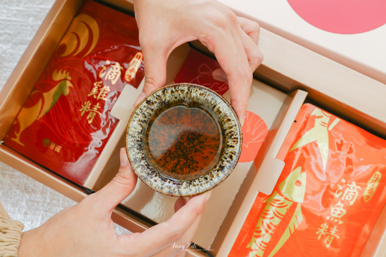 ▲中秋禮盒附贈的天目釉品茗杯,容器大小剛好來裝一包滴雞精或滴魚精。