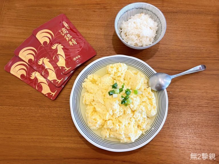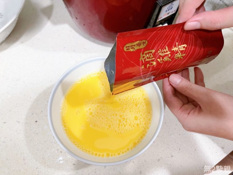 首先把蛋攪拌均勻再添加水繼續攪拌,之後倒入芳茲滴雞精。