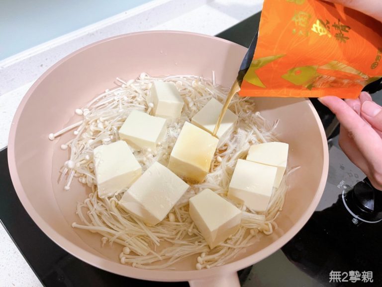 預熱平底鍋,再放入豆腐和金針菇,接著倒入滴魚精。