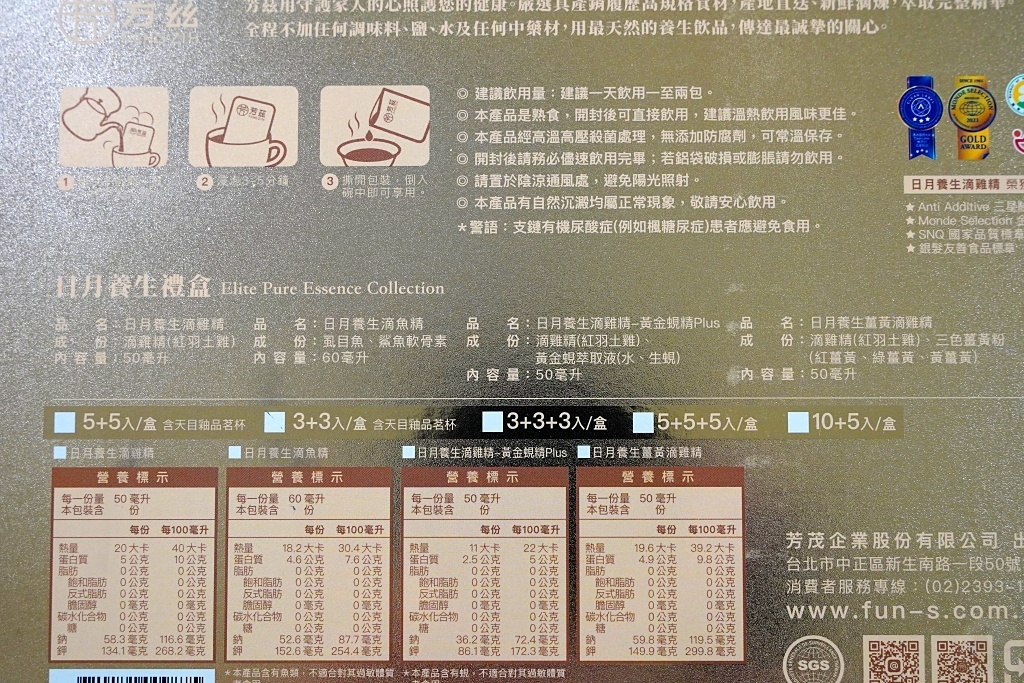 日月養生雞魚饗宴禮盒是芳茲與台灣著名老品牌『波蜜』果菜汁團隊攜手合作的產品,一直把品質和安全放在首位。所選擇的食材都經過嚴格把關,從食材的來源一路到製造過程,都堅持使用最優秀的原料,而且只在符合標準的工廠進行生產,讓消費者可以放心享用這款健康飲品。
