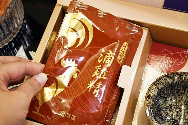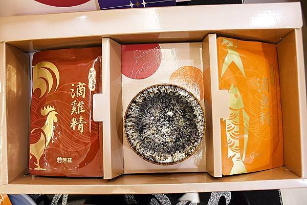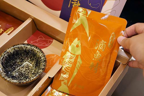 這次我所挑選的是芳茲雞魚雙饗的組合,共有五包滴雞精、五包滴魚精,同時附有天目釉品茗杯,不僅典雅高雅又大方