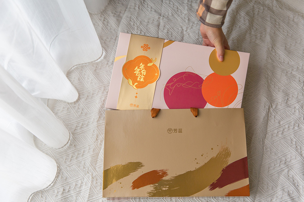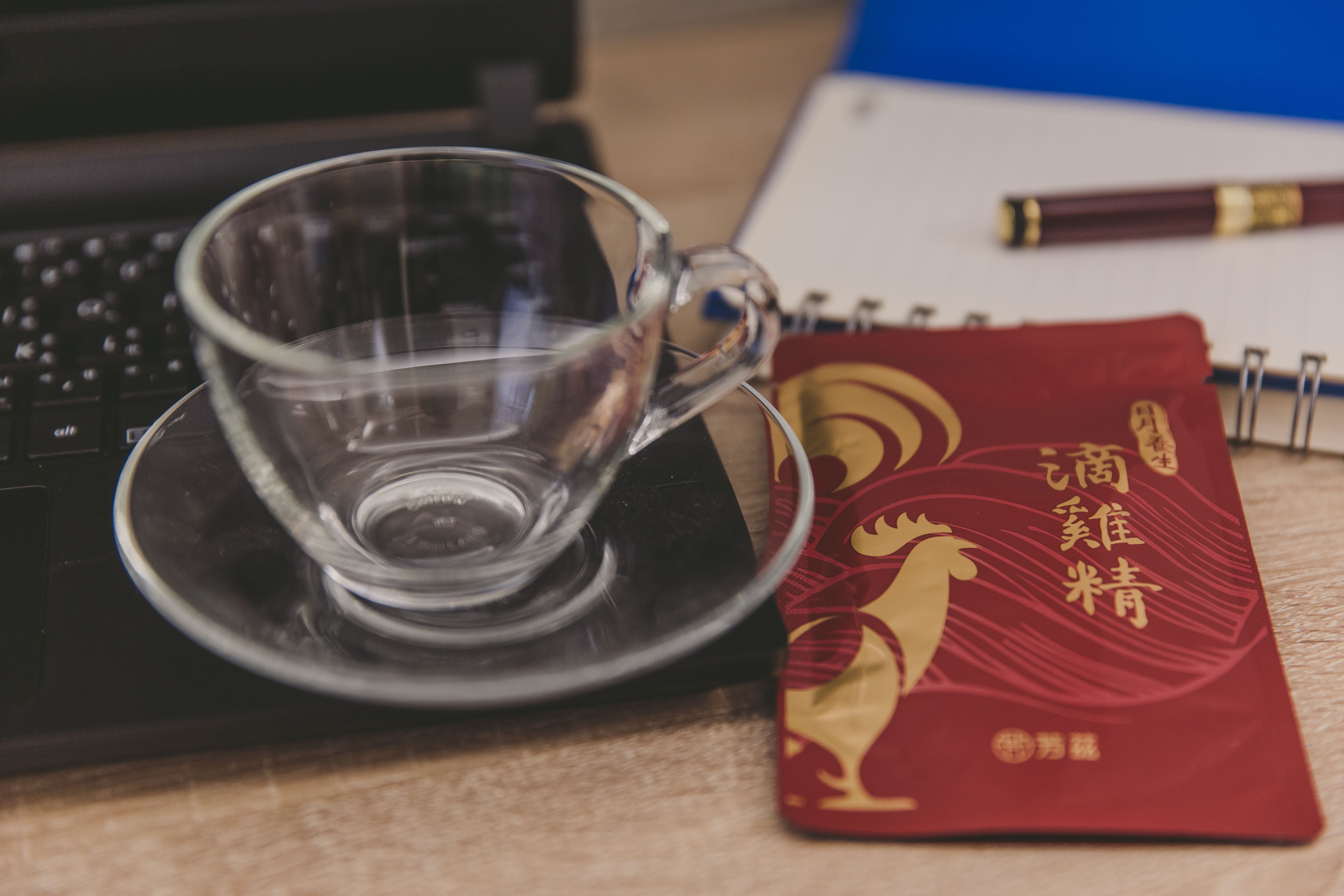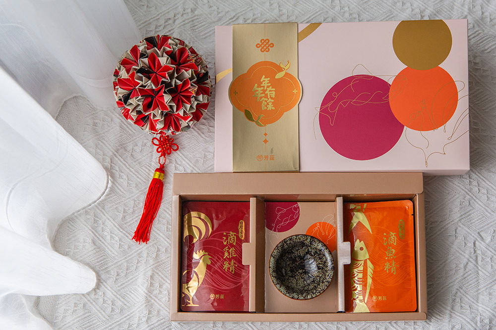 芳茲的禮盒也設計的相當精美,粉紅外盒及金色的顏色搭配,提袋以金色為底加上燙金花紋,以及特製的「年年有餘」新年腰封,有著新的一年讓健康與夢想隨行的美好寓意,整體搭配起來也非常喜氣,很適合親戚長輩過年送禮。禮盒內還附贈一只「天目釉品銘杯」,每只品銘杯花紋都不同而且非常特殊,整個非常有質感,用它來喝雞精、魚精甚至喝茶都非常適合。