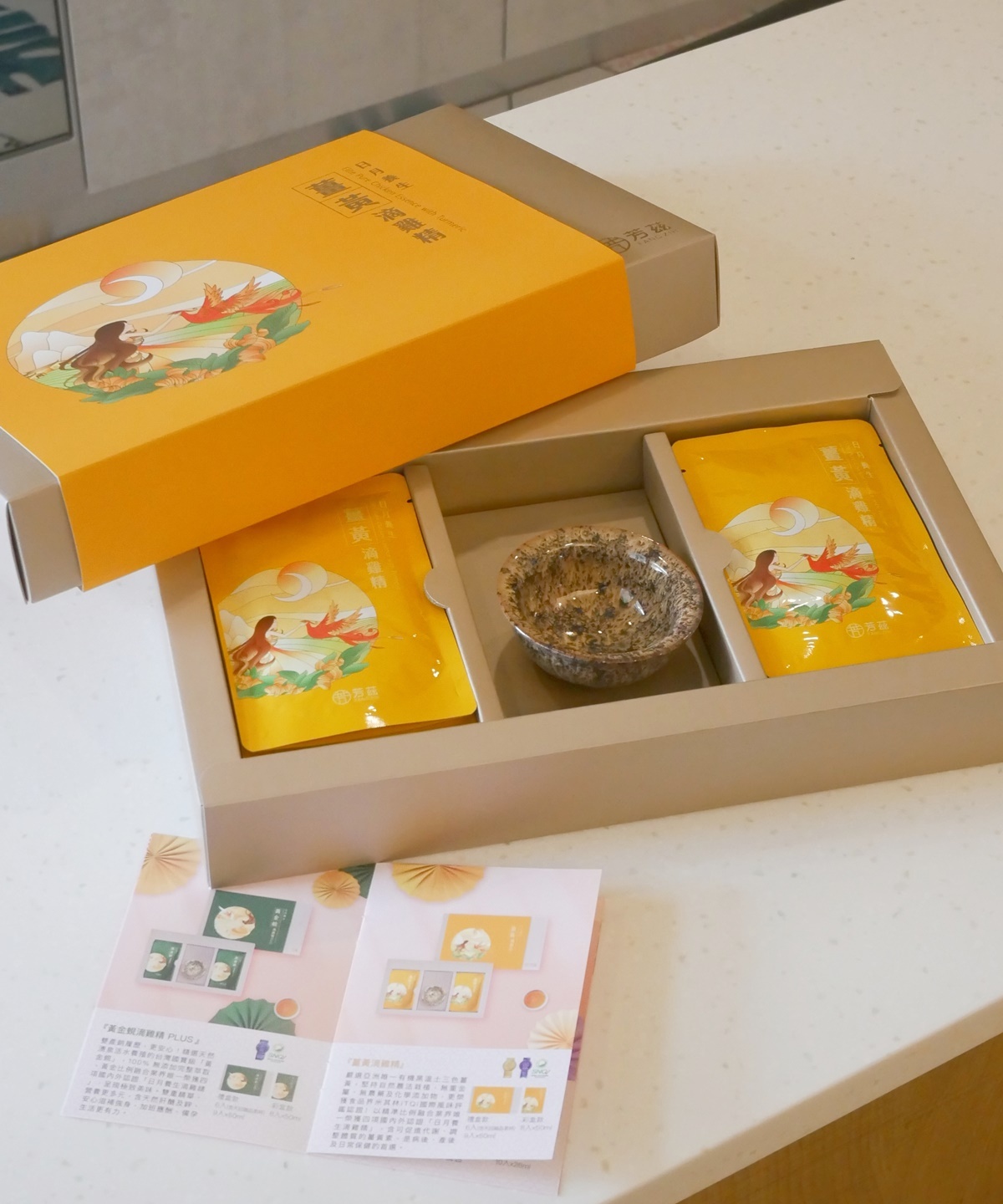 我自己是很注重生活儀式感的人,這一款日月養生薑黃滴雞精禮盒內還有附上飲用說明書,用圖式法更簡單易懂,裡面更附贈了一份特別的禮物,一個設計獨特的手工「天目釉品茗杯」,看起來優雅、高品質,甜蜜超喜歡的,倒入一包薑黃滴雞精真的剛剛好,加上上次滴魚精附贈的,甜蜜把他們湊成了一對啦!!