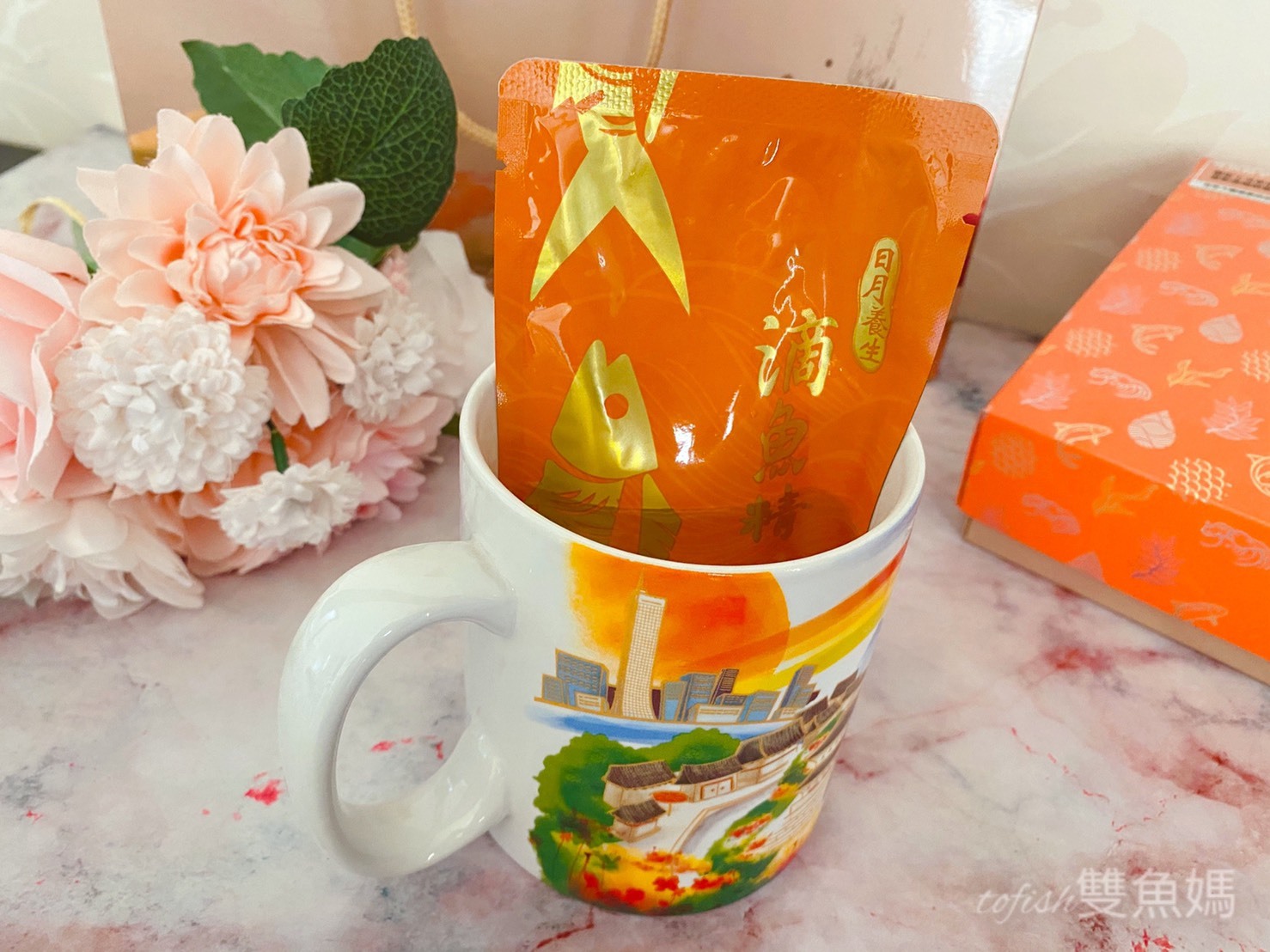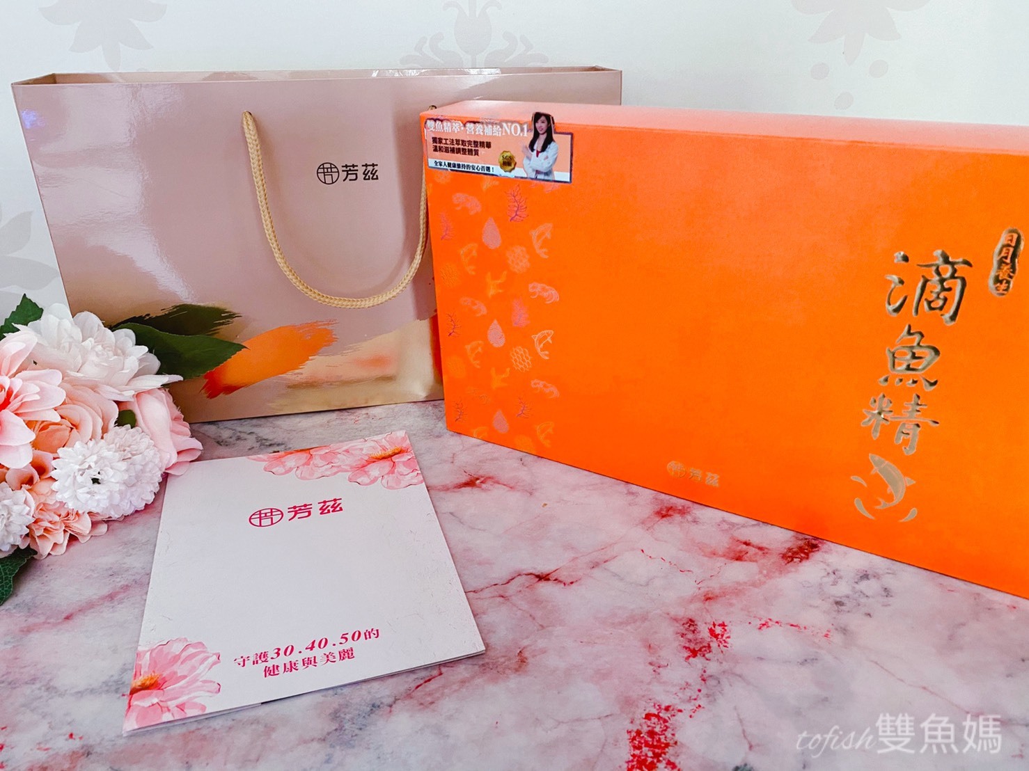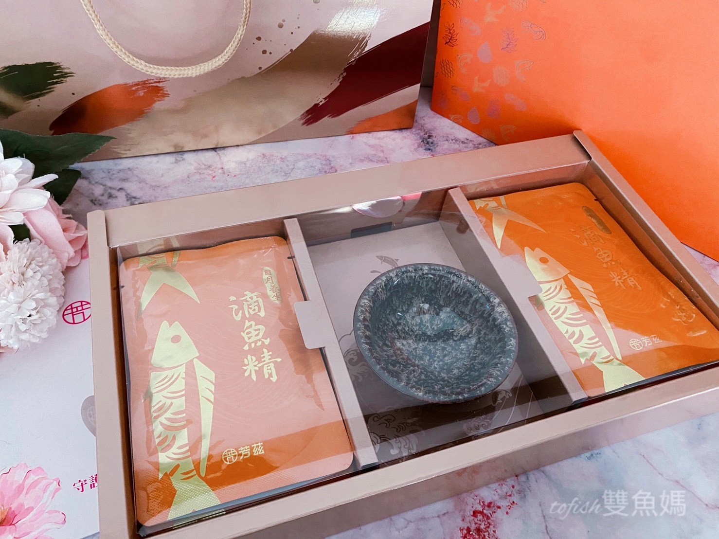 芳茲生技日月養生滴魚精禮盒款外盒是以橘色為主