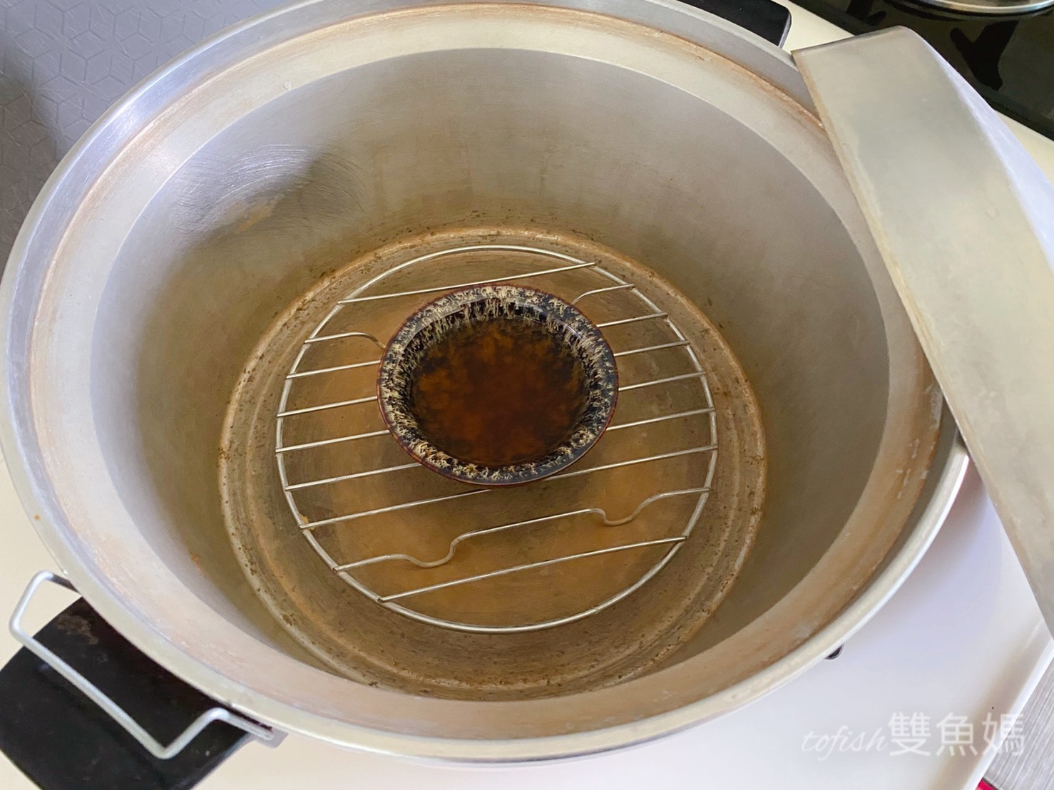 電鍋蒸熱:撕開鋁袋,將滴魚精倒入碗中,電鍋內加半杯水,蒸5-8分鐘