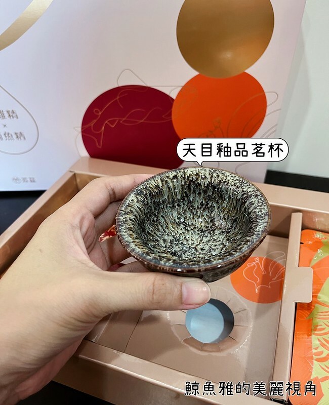 雞魚饗宴禮盒可以一次喝到滴雞精與滴魚精,各5包。同時禮盒內還有贈送一個色澤鮮艷富有古色古香的『天目釉品茗杯』,讓整個禮盒增添質感與亮點!多麼美麗的杯子讓人一開盒就忍不住多停留兩秒~