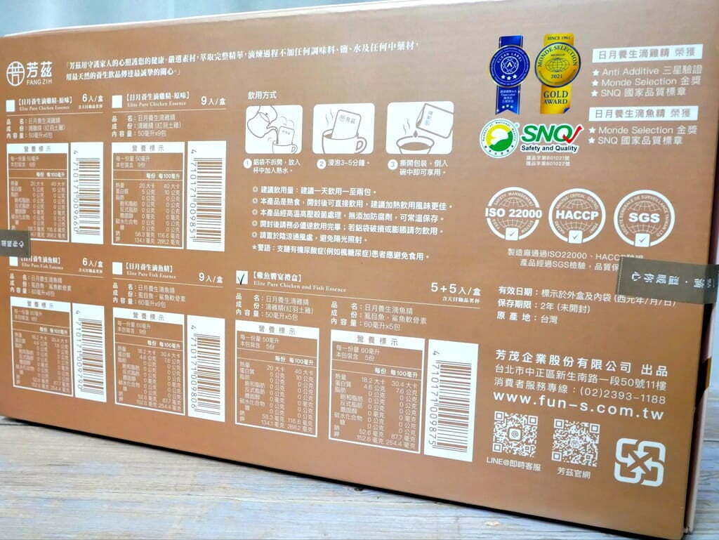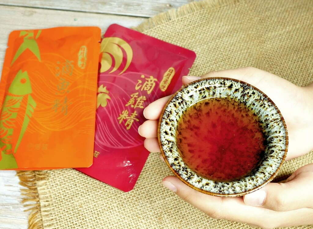 他們家的滴雞精是透過「獨家蒸氣不回流」的技術,簡單來說就是食材與蒸氣是分離的,讓食材完全不會與水分接觸到並用恆溫高壓滴煉,來達到真正不加一滴水的滴雞精,每一包都保留雞隻完整精華,並含有蛋白質、總支鏈胺基酸和膠原蛋白,是一個滿滿全雞精華的養身保健飲品。