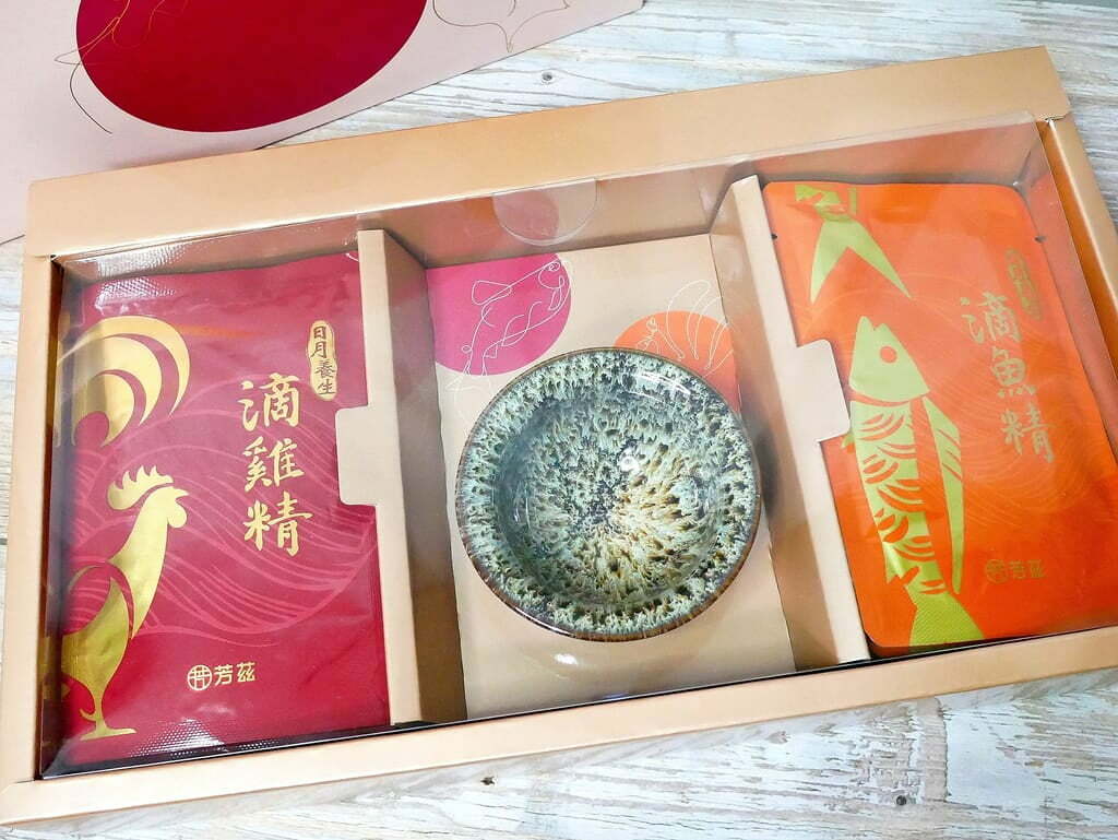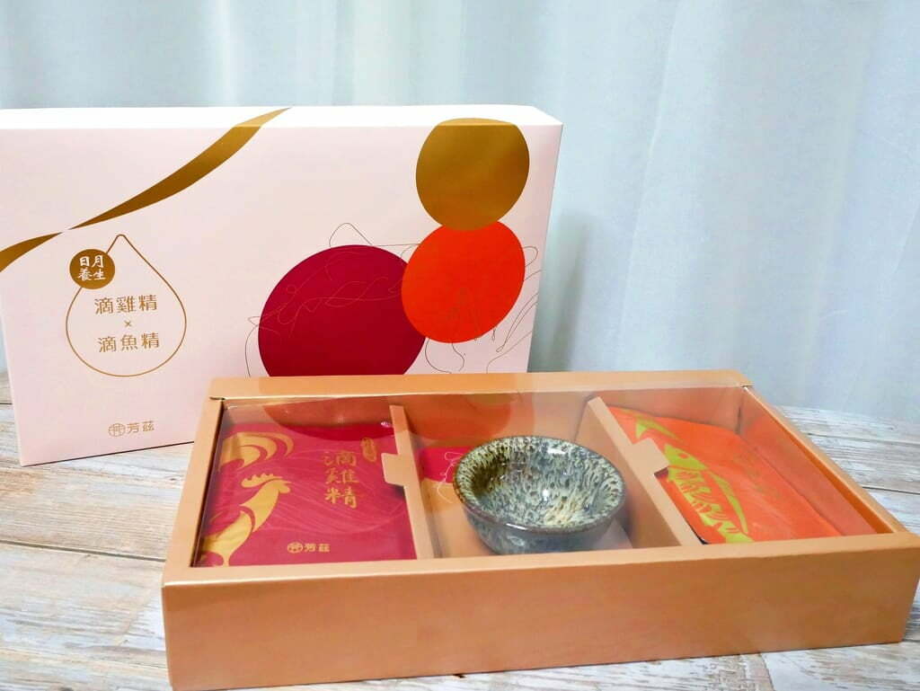 日月養生雞魚饗宴新年禮盒為10入裝的精緻禮盒,滴魚精和滴雞精各五包,分別整齊擺著並區隔開,收到時內容物相當完整