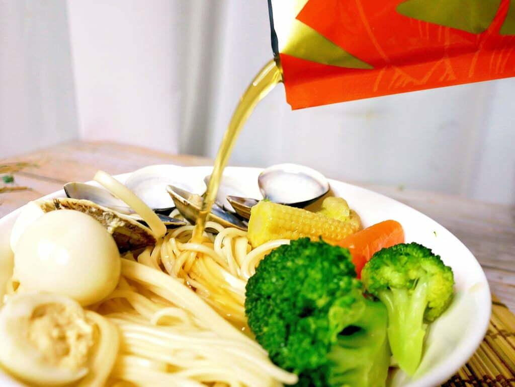 這天晚上天氣好冷,玉媽咪準備了蔬菜湯麵讓寶貝們吃,煮完上桌後, 分別各倒入一包日月養生滴魚精,讓孩子不僅可以吃到蔬菜又能補充到更多營養。