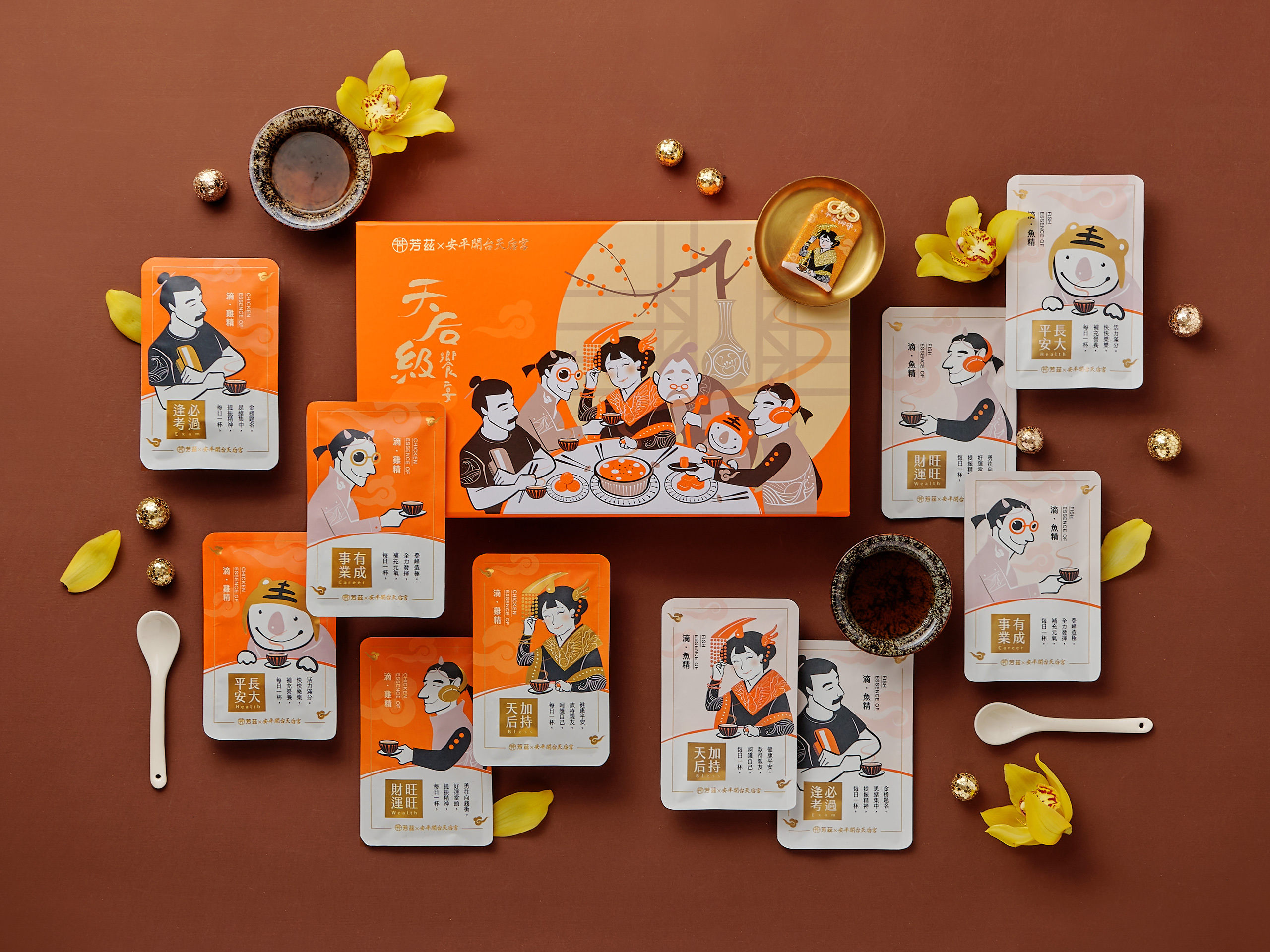 農曆新年將至,台灣人習慣到各地廟宇走春,祈求一家人平安健康,順便擲筊求個吉祥好彩頭,看準這樣的祈福風潮,芳茲生技也攜手全台第一座媽祖廟台南安平開台天后宮,推出「天后級饗宴」聯名禮盒,象徵大吉大利,裡頭除了有可以常溫保存的滴雞精和滴魚精,還有天后宮過爐加持的媽祖平安御守,與祈福聖杯-天目釉品茗杯,讓收禮的人可以感受到滿滿的平安祝福。