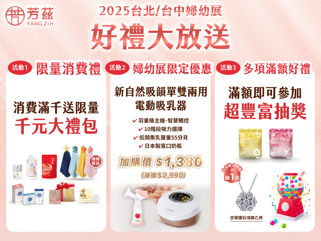 婦幼展限定福利也不容錯過,展場提供全品項產品免費試飲,展覽期間祭出重磅優惠,消費滿千即可獲得價值千元大禮包,達指定金額再加碼抽鑽石項鍊(台北場與台中場共抽出一名幸運得主)。針對新生兒推出寶寶祝福禮預購組,享8折價5,800元,內含芳茲滴雞精環保包組30包、新生兒衣服26件組及14吋粉白配色手提行李箱,滿足寶寶營養與日常需求;另針對產後媽咪,推出COMBI新自然吸韻電動吸乳器,至芳茲攤位消費享展場加購價1,380元。各位孕媽咪、準爸媽心動不如行動,即日起到7月14日在台北婦幼展、7月18日到7月21日台中婦幼展。