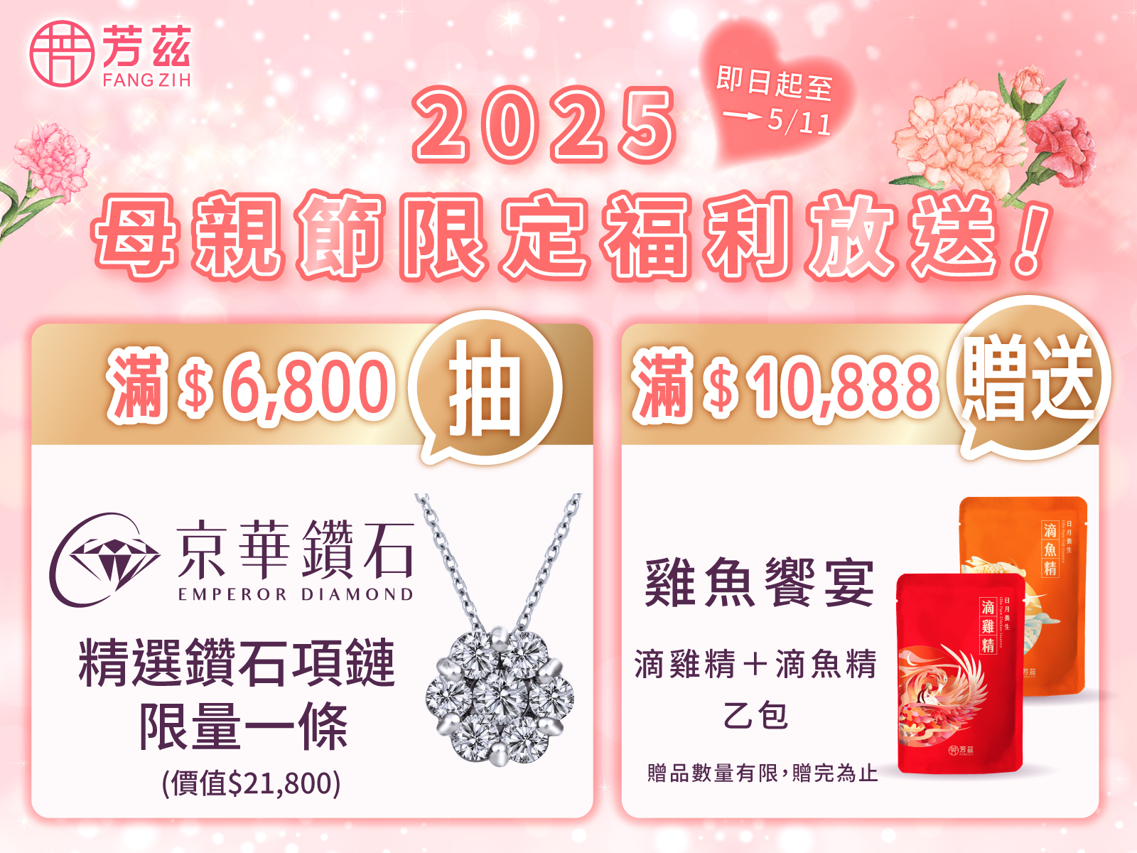 「璀璨真心禮盒」貴氣質感滿分,無論送禮或自用都超有儀式感!即日起至5/11於芳茲全館單筆消費滿 6,800元,就有機會抽中京華鑽石項鍊(共一名);消費滿10,888元,即贈送芳茲滴雞精+滴魚精各一包(不累贈)。