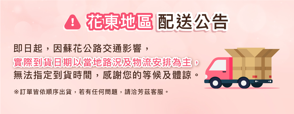 即日起,因蘇花公路交通影響,實際到貨日期以物流安排為主,無法指定到貨時間,感謝您的等候及體諒。