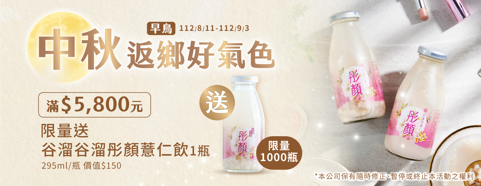 .海外地區恕不適用單筆消費滿$5,800送谷溜谷溜彤顏薏仁飲活動之優惠活動。