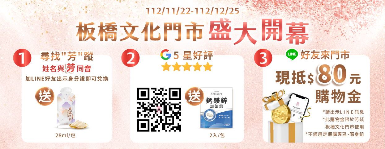 .開幕期間於板橋文化門市與芳茲商品拍照,並至Google評論給予五星好評,即可獲得亞尼活力鈣鎂鋅加強錠體驗組3組(2入/組)