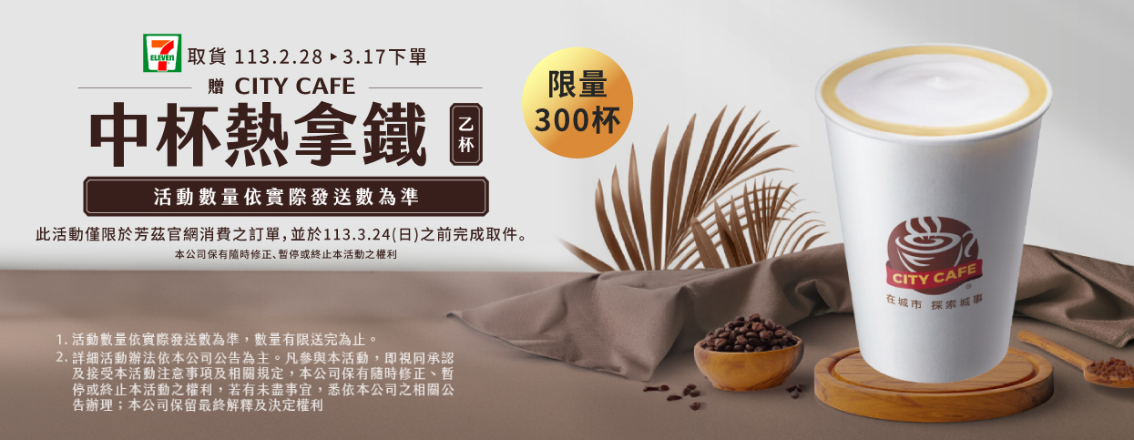 於指定日期 113.03.24 前完成 7-11 超商取貨,即可獲得乙杯 CITY CAFE 熱拿鐵 ( 中杯 )之兌換劵序號。